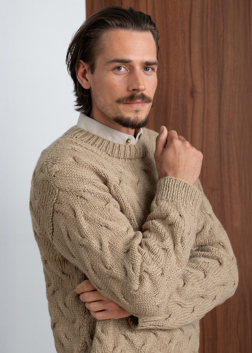 Lana Grossa Cool Merino Big (90% scheerwol (merino), 10% polyamide, ca. 90 m/50 g), 700 (750 – 800) g beige (kl 240); breinld 5 mm en 7 mm, breinld zonder knop 5 mm of 1 rondbreinld 5 mm (40 cm lang), 1 kabelnaald.