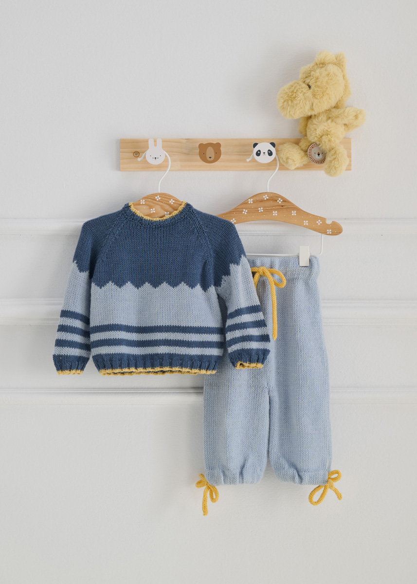 Lana Grossa Cool Wool Baby (100% scheerwol (merino extrafijn); ca. 220 m/50 g): 50 (50/100/100) g duifblauw (kl. 263) en 50 g lichtblauw (kl. 208) en geel (kl. 273); rondbreinld 2,5 en 3 mm; markeerringen; 3 drukkers met 7 mm Ø.