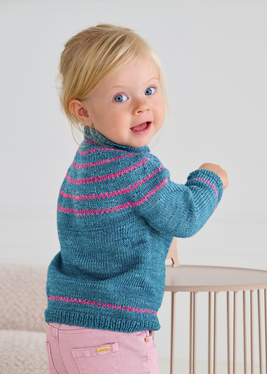 Lana Grossa Cool Wool Vintage (100% scheerwol (merino extrafijn); ca. 160 m/50 g): 150 g petrol (kl. 7379) en 50 g felroze (kl. 7389); rondbreinld 3,5 mm; markeerringen.