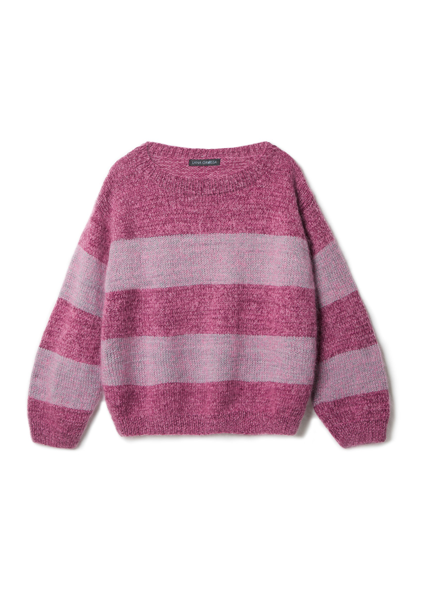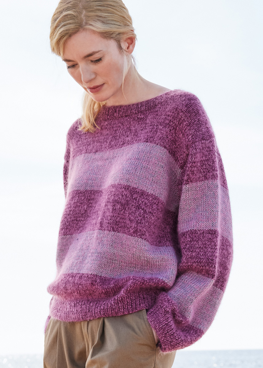 Lana Grossa Cool Wool Vintage (100% scheerwol (merino extrafijn), ca. 160 m/50 g), 150 (200 - 200 - 250) g lichtgrijs (kl 7369) en 250 (250 - 300 - 300) g pruim (kl 7365). Lana Grossa Silkhair (70% mohair (superkid), 30% zijde, ca. 210 m/25 g), 150 (150 - 175 - 200) g felroze (kl 162), breinld 4,5 mm en 5 mm, een 50 cm lange rondbreinld 4,5 mm