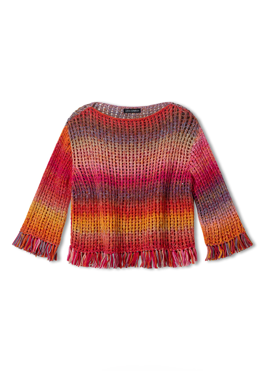 Lana Grossa Cotonella (100% (Pima) katoen, ca. 280 m/100 g), 300 (300) g in camel/felroze/fuchsia/roodviolet/ grijs/sering/geeloranje/rood/geel (kl 19) en Lana Grossa Cottonhair (70% mohair (superkid), 30% katoen, ca. 450 m/50 g), 100 (100) g in kreeftrood/oranje/lichtoranje/felroze/ fuchsia/roest (kl 101). Breinld 4 mm en 6 mm, 1 haaknld 5 mm.
