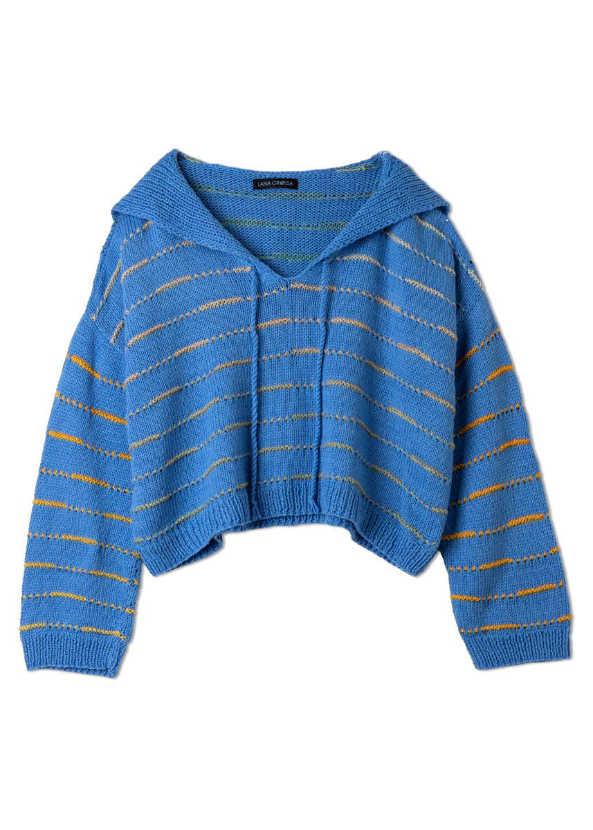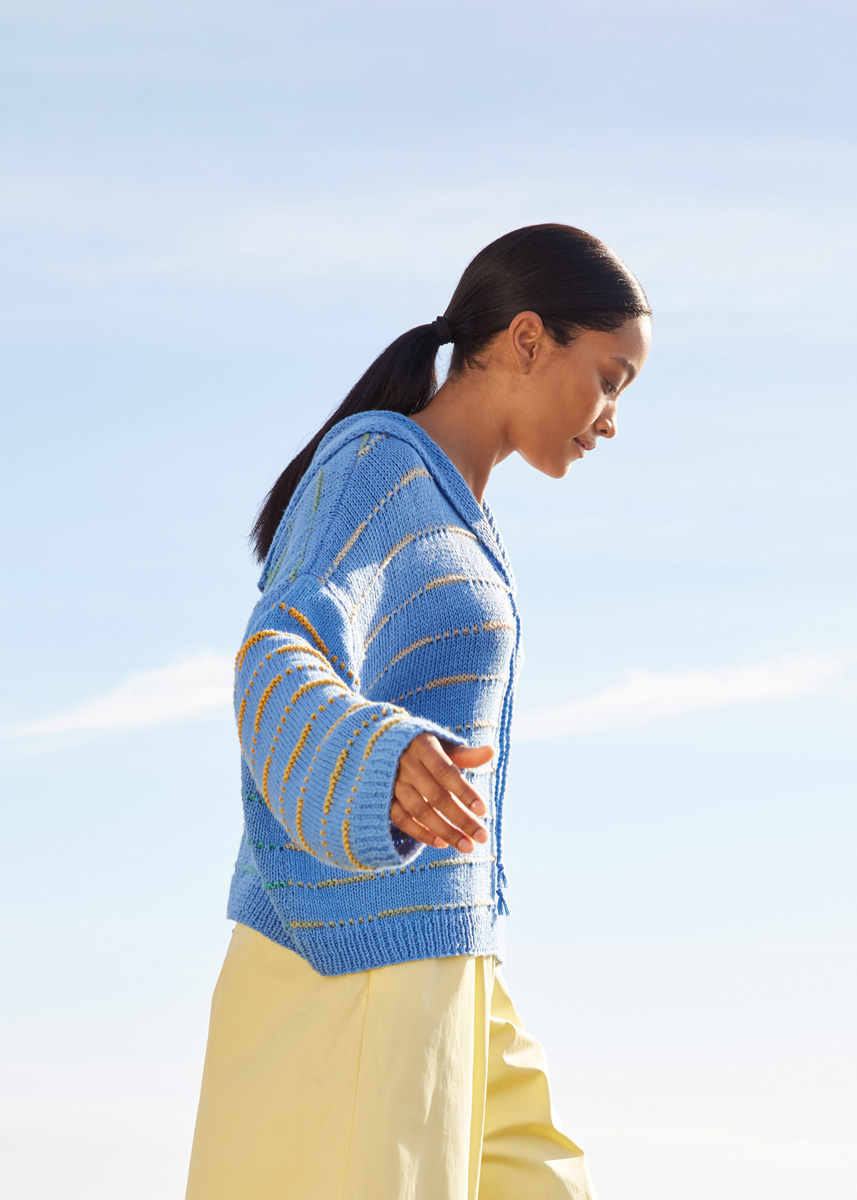 Lana Grossa Cotonella (100% (Pima) katoen, ca. 280 m/100 g), 400 (500 - 500) g in hemelsblauw (kl 208) en 100 (100 - 100) g in grijsgroen/bruin/goud-/zonnegeelngeel/ pastelblauw/perzik/groenbeige/turquois (kl 14). Breinld 3 mm en 5 mm.