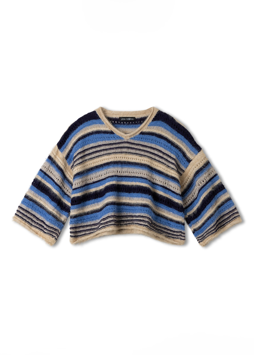 Lana Grossa Finito (73% katoen, 27% polyamide, ca. 200 m/50 g), 150 (200 - 250 - 250) g in camel/crème (kl 26). Lana Grossa Per Fortuna (74% katoen, 26% polyamide, ca. 150 m/50 g), 100 (100 - 150 - 150) g in viooltjesblauw (kl 62). Lana Grossa Filo Paillettes (55% katoen, 39% polyester, 6% polyamide, ca. 155 m/50 g), 100 (150 - 150 - 200) g in lichtbeige (kl 18). Lana Grossa Tencellino (51% linnen, 49% tencel, ca. 125 m/50 g), 150 (200 - 250 - 250) g in nachtblauw (kl 18). Breinld 4 mm en een 40 cm lange rondbreinld 4 mm.