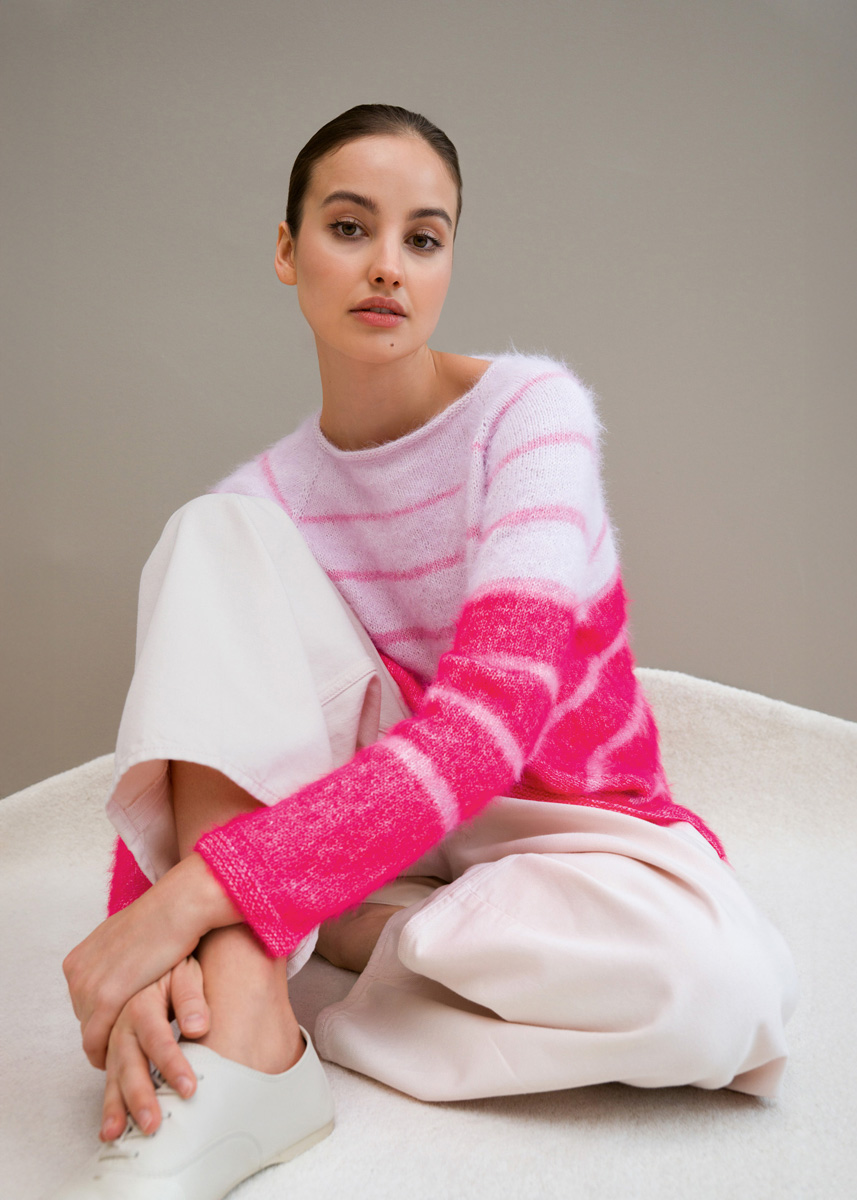 Lana Grossa Finito (73 % katoen, 27 % polyamide, ca. 150 m/50 g), 150 (150 – 200 – 200) g seringroze/ crème (kl 17), 100 (100 – 150 – 150) g pastelroze/crème (kl 18), 250 (250 – 300 – 300) g snoepjesroze/crème (kl 19); rondbreinld 4 mm, lengte 60-100 cm; 8 markeerringen.