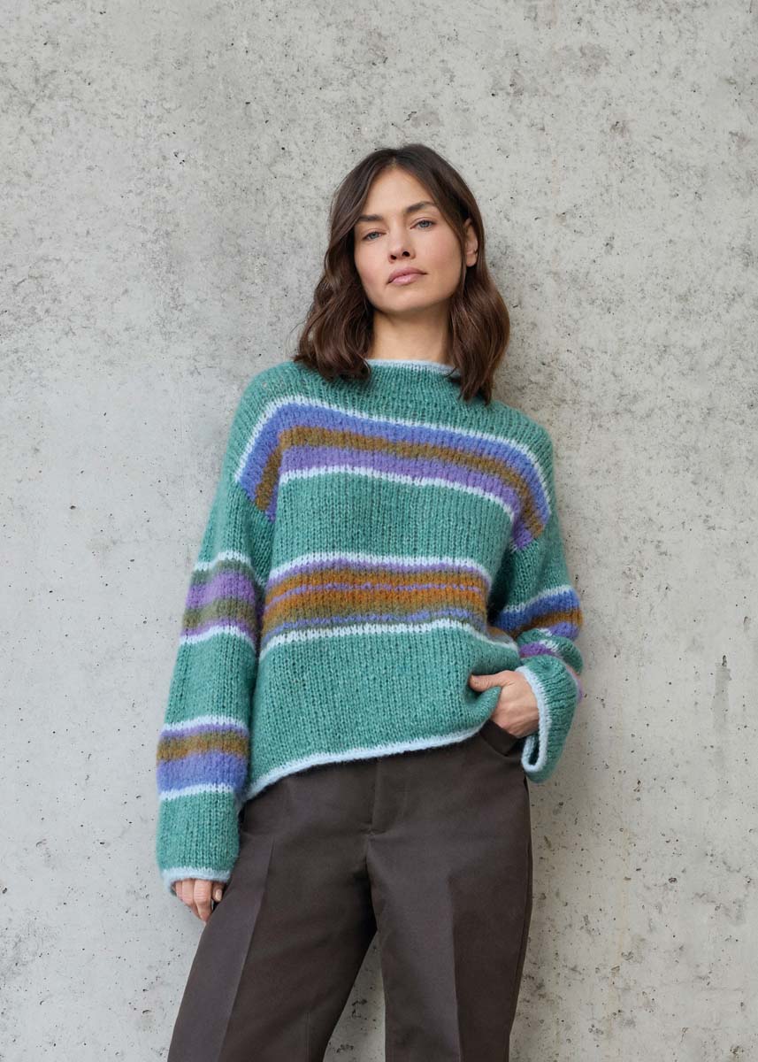 Lana Grossa-garen ‘Alpaca Air II’ (50% alpaca (baby), 27% polyamide, 14% katoen, 9% scheerwol (merino), ca. 140 m/50 g): 50 (50 - 100 - 100) g pastelblauw (kl 28), 150 (200 - 250 - 300) g licht zeegroen (kl 23), Lana Grossa-garen ‘Gigante’ (70% alpaca (fijn), 30% polyamide, ca. 300 m/100 g): ca. 100 (100 - 200 - 200) g violet/viooltjesblauw/mosgroen/ kaki/oker (kl 14); korte en lange rondbreinld 7 mm.