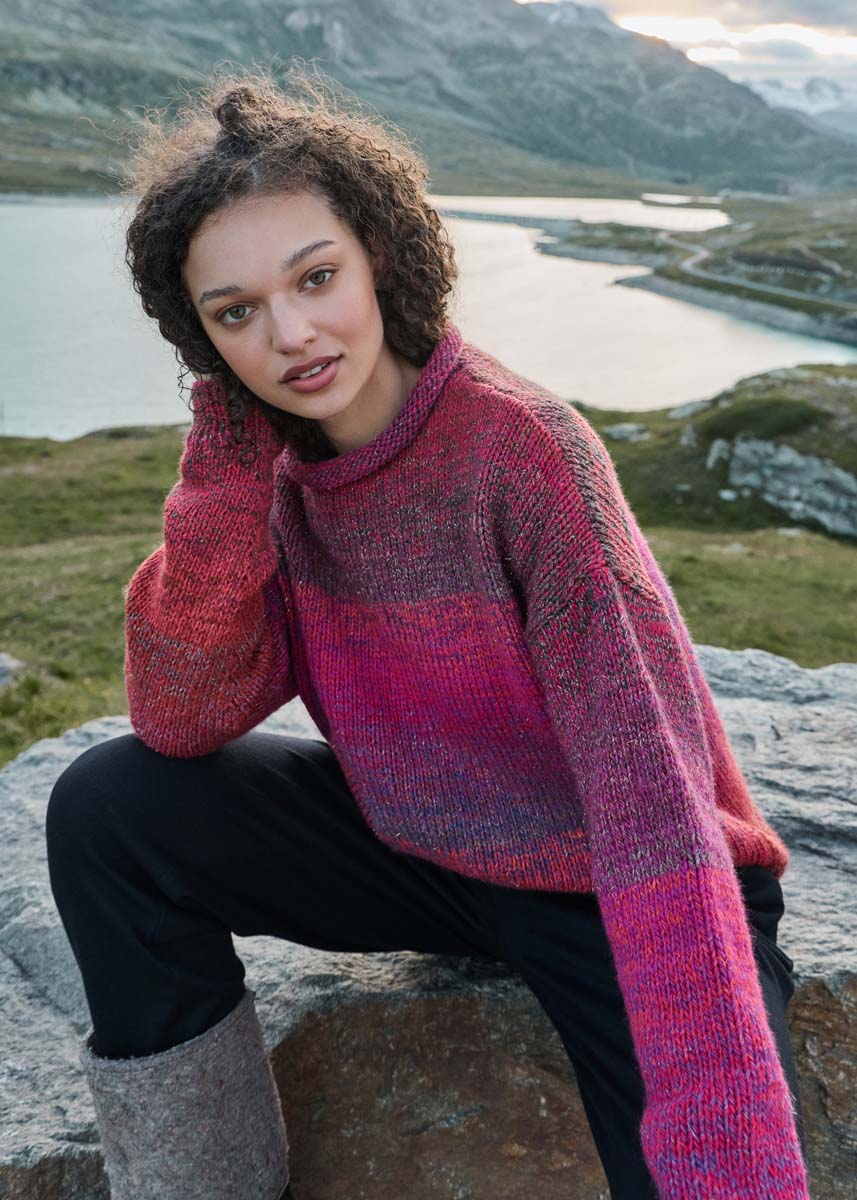 Gomitolo Gala van Lana Grossa (60% scheerwol, 38% polyacryl, 2% polyester, LL=ca 700 m/200 g): 2 (2 - 2 - 2) klw. = ca 400 (400 - 400 - 400) g bourgogne/ zwartrood/roodviolet/purpur/blauwviolet/donkerblauw/roestrood/ terracotta (kl. 4029) en 2 (2 - 2 - 2) klw. = ca 400 (400 - 400 - 400) g grijsbruin/wijn-/donker-/kersenrood (kl. 4031). Breinld.nr. 5 en 6. Korte rondbreinld.nr. 5.