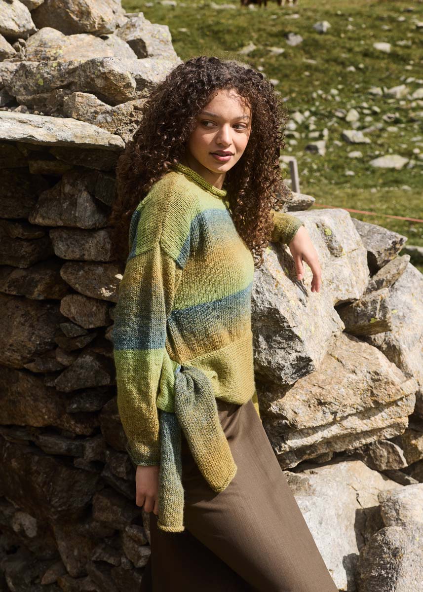 Gomitolo Gala van Lana Grossa (60% scheerwol, 38% polyacryl, 2% polyester, LL=ca 700 m/200 g): 2 (2 - 3 - 3) klw. = ca 400 (400 - 600 - 600) g woud-/mosgroen/ okerbruin/pistache (kl. 4035). Breinld.nr. 4. Korte rondbreinld. nr. 3,5.