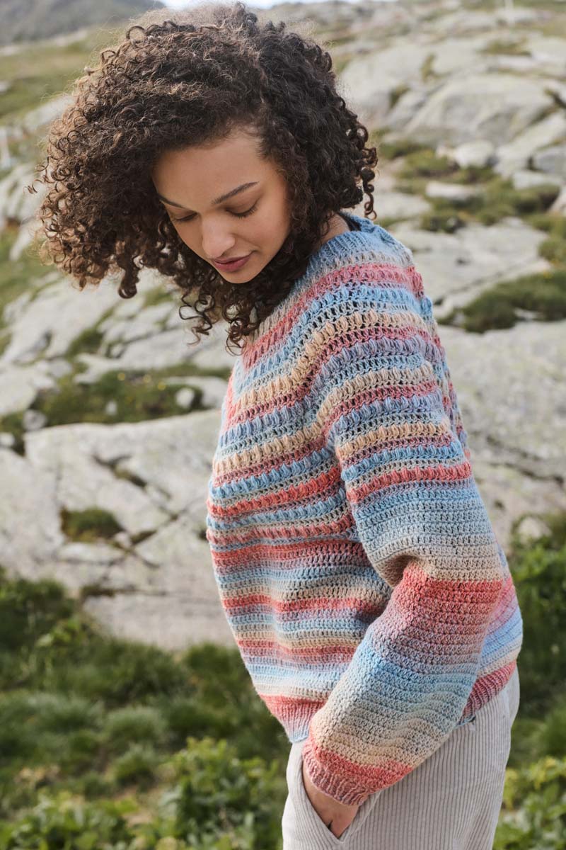 Gomitolo Gala van Lana Grossa (60% scheerwol, 38% polyacryl, 2% polyester, LL=ca 700 m/200 g): 2 (3 - 3 - 3) klw. = ca 400 (600 - 600 - 600) g roest/grijsrood/ turkoois/turkooisgrijs/taupe (kl. 4033). Korte en langere rondbreinld. nr. 3,5. Nld. zonder knop nr. 3,5. Haaknld.nr. 4.