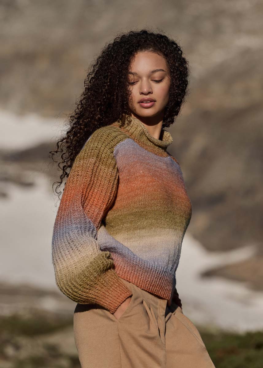Gomitolo Versione van Lana Grossa (60% scheerwol, 40% polyacryl, LL=ca 700 m/200 g): 2 (2 - 2 - 3) klw. = ca 400 (400 - 400 - 600) g blauwgrijs/ree-/oranjebruin/ kakigroen/-beige/ivoor/grijsbeige (kl. 458). Breinld.nr. 4 en 4,5. Korte en wat langere rondbreinld.nr. 4.