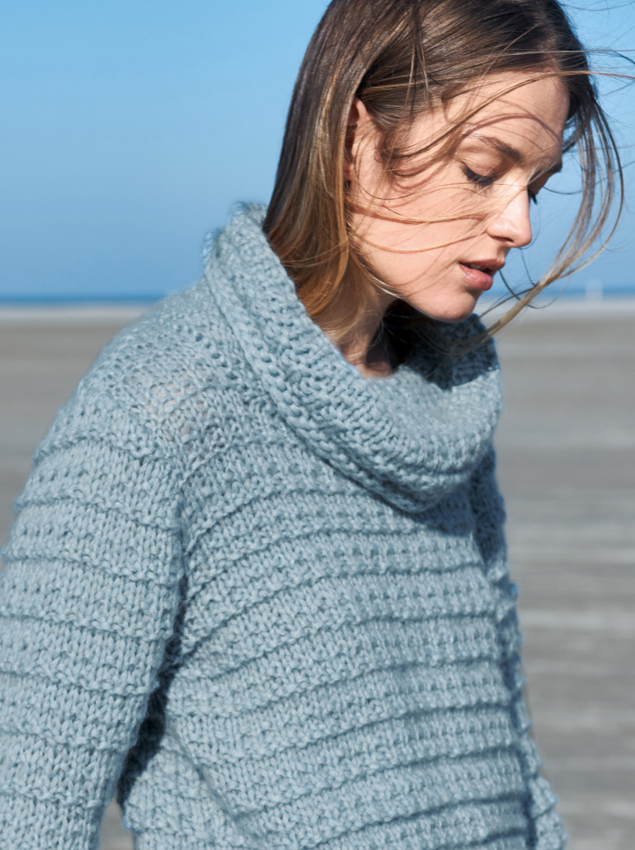 HET GEMAKKELIJK RECHTS-LINKS PATROON krijgt een interessante structuur die ingewikkelder lijkt vanwege de extreem losse en met grote naalden gebreide steken, voor deze combinatie is dit garen gemaakt. Na een paar rijen kunt u het patroon uit uw hoofd.