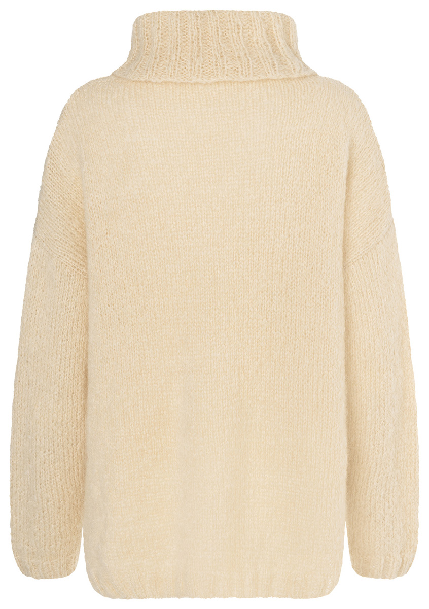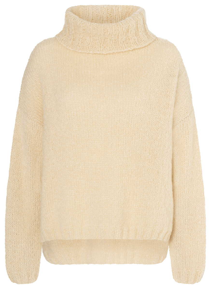 „Lala Berlin Brushy“ (42% mohair (superkid), 38% scheerwol (merinoswol), 20% polyamide, ll. = ca. 135 m/50 g) van Lana Grossa: ca. 350 (400 – 450 – 500) g beige (kl. 7) of gifgroen (kl. 4); breinaalden nr. 5 en 6; 1 rondbreinaald nr. 5, 50 cm lang