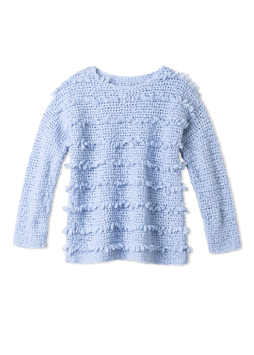 Lana Grossa-garen ‘Caramella’ (53% scheerwol (merino), 25% (baby) alpaca, 22% polyamide, ca. 110 m/50 g): ca. 500 (550 – 600) g babyblauw (kl 10); 1 haaknld 8 mm.