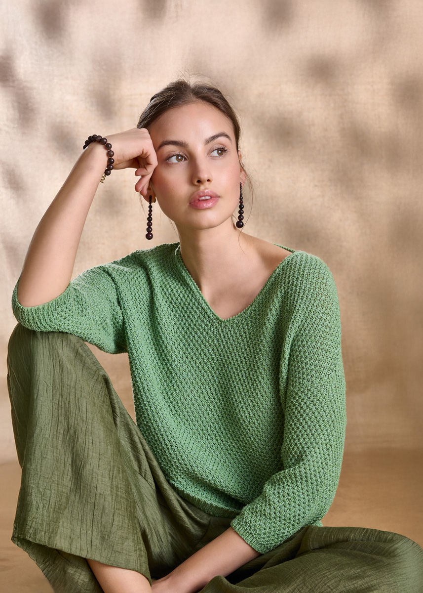 Lana Grossa Landlust Sommerseide (50% zijde, 50% katoen, ca. 170 m/50 g), 350 (400 – 450) g appelgroen (kl 36); breinld 3 mm en 4,5 mm, en 1 haaknld 3,5 mm.