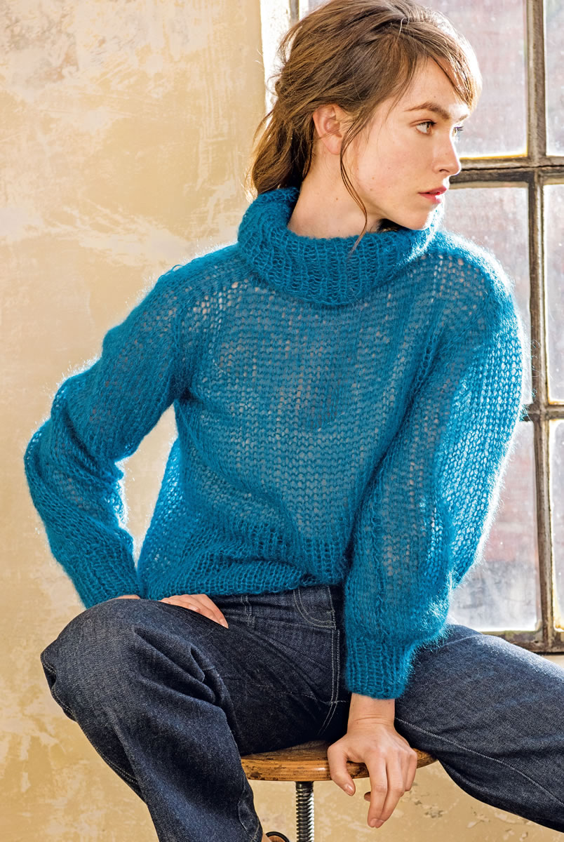 garen van Lana Grossa ‘Silkhair’ (70% mohair superkid, 30% zijde, ca. 210 m/25 g), 150 g petrol (kl 23). 1 korte en 1 lange rondbreinld nr 7 en nr 10; 3 hulpnld.