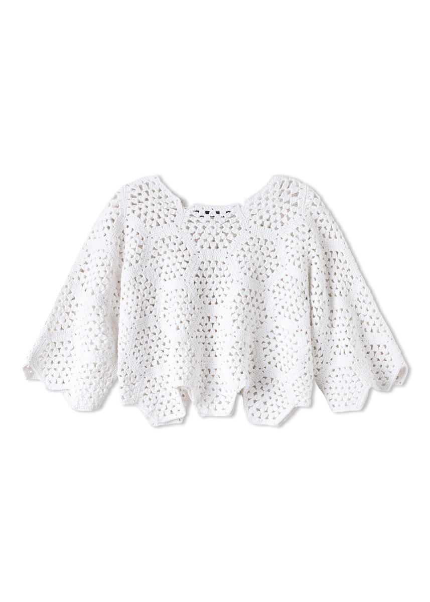 Lana Grossa-garen ‘Promessa’ (70% katoen (bio), 30% polyamide (recycled), ca. 125 m/50 g): 550 (700) g wit (kl 13); haaknld 4 mm.