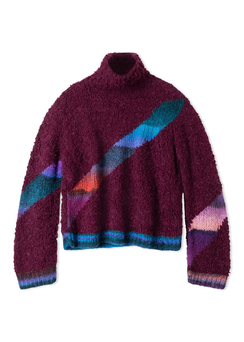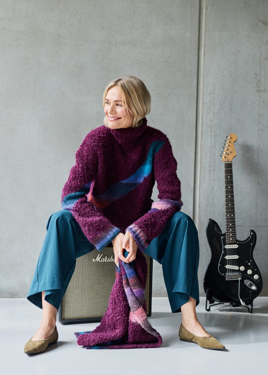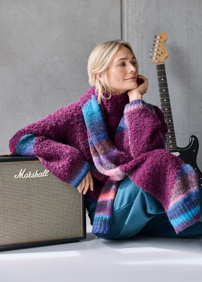 Lana Grossa-garen ‘Orsetto’ (60% scheerwol (merino), 40% alpaca (superfijn), ca. 75 m/50 g): ca. 300 (350 – 400) g Bourgondisch rood (kl 5) en Lana Grossa-garen ‘Bomba’ (85% scheerwol (merino extrafijn), 15% polyamide, ca. 290 m/100 g): ca. 100 (200 – 200) g zalm/grijsrood/donkerviolet/turkooisblauw/ blauwpetrol/koningsblauw (kl 3); breinld 4 mm en 6 mm, 1 rondbreinld 4 mm, 40 cm lang.