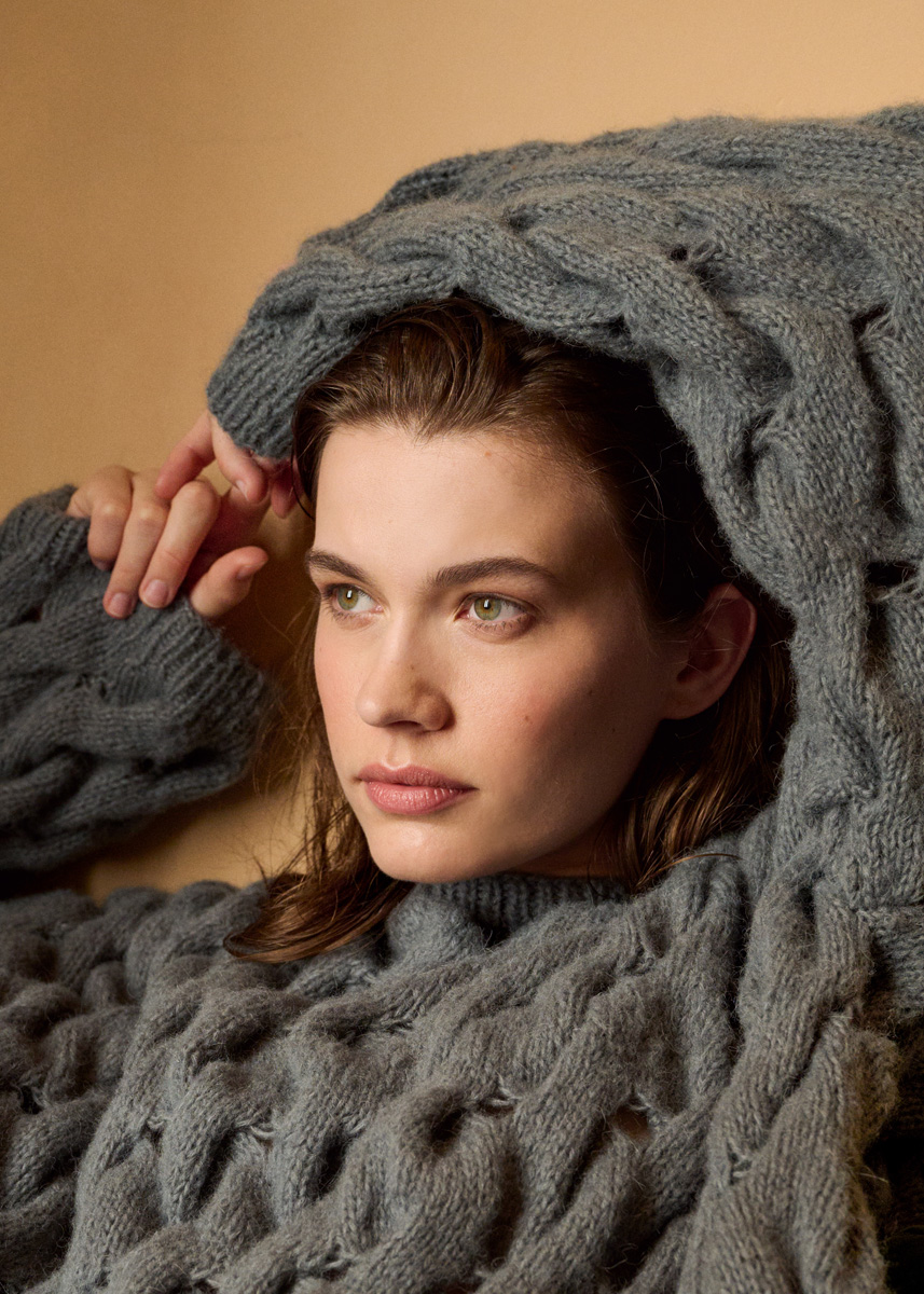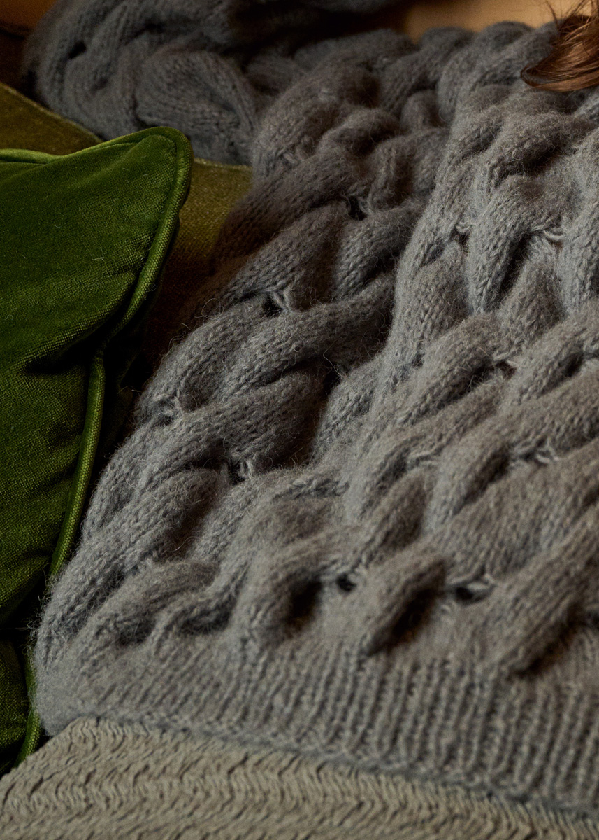 Lana Grossa-garen ‘Nebbia’ (55% scheerwol (merino extrafijn), 45% alpaca (baby), ca. 170 m/50 g): 500 (550 - 600) g donkergrijs (kl 7); breinld 4,5 mm en 6 mm; 1 korte rondbreinld 4,5 mm; 1 kabelnaald