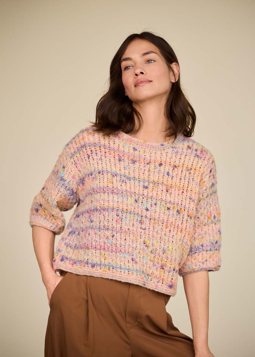Lana Grossa-garen ‘Cassata’ (54% scheerwol (merino extrafijn), 30% polyamide, 16% katoen, ca. 175 m/50 g): 150 (200 - 200 - 250) g perzik/blauw/geel/oranje/sering (kl 1); breinld 4,5 mm en 6 mm; 1 korte rondbreinld 4,5 mm