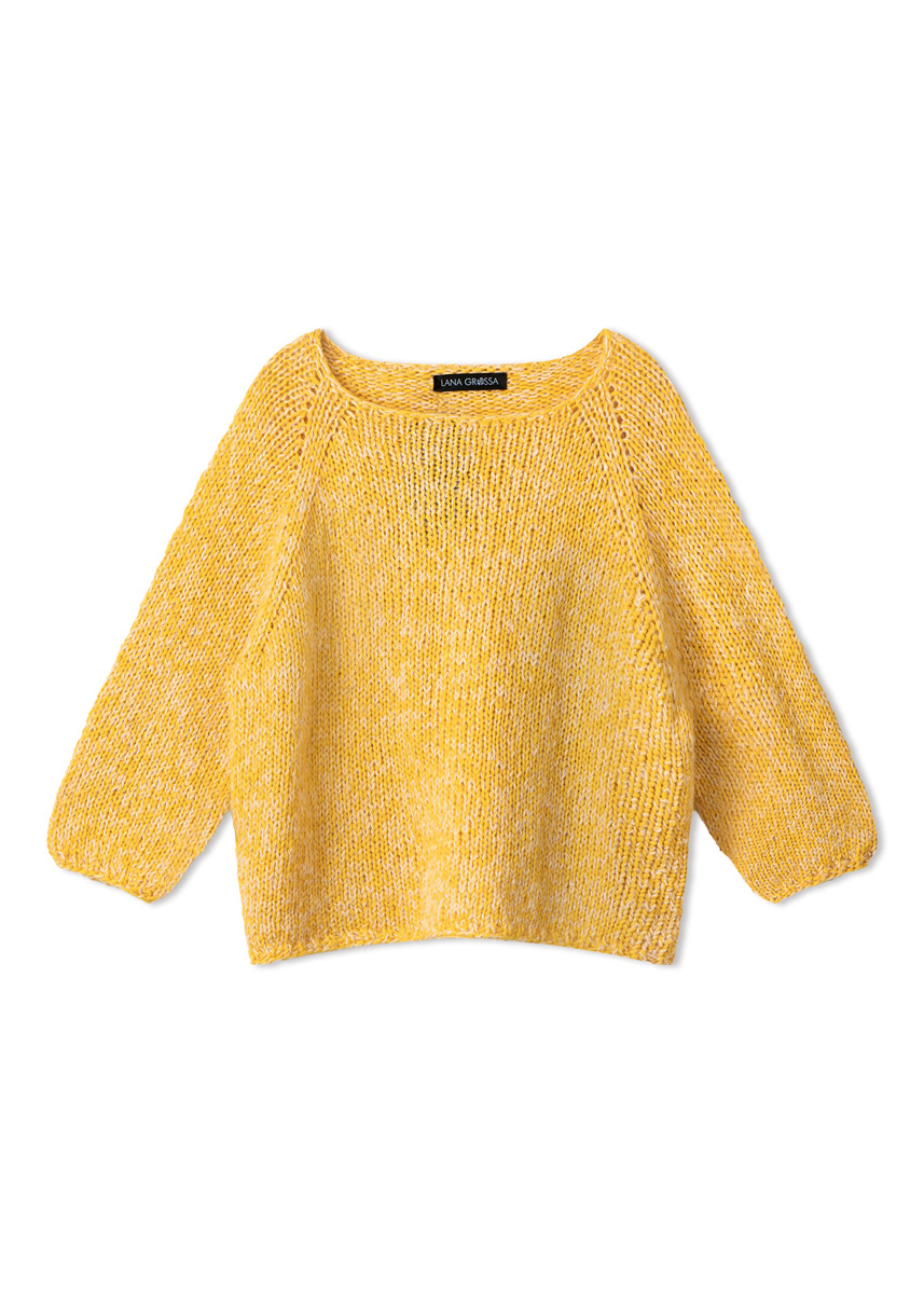 Lana Grossa-garen ‘Summer Softness’ (80% katoen (bio), 20% scheerwol (merino superfijn), ca. 130 m/50 g): ca. 250 (300 - 350 - 400) g eierdooiergeel (kl 21); Lana Grossa-garen ‘Setasuri Pearls’ (50% alpaca (suri), 22% zijde, 16% katoen, 12% glasvezels, ca. 140 m/25 g): ca. 75 (100 - 100 - 125) g lichtbeige (kl 201); korte en lange rondbreinld 7 mm; markeerringen.