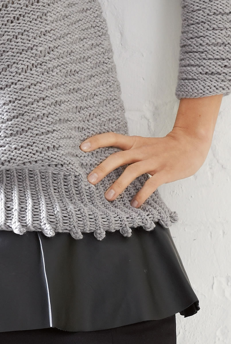 ca. 450 (500) g „Superbingo“ (100% scheerwol (extrafijne merinoswol), ll. = ca. 55 m/50 g) van Lana Grossa in lichtgrijs gemêleerd (kl. 14); breinld. nr. 5 en 5,5; 1 haaknld. nr. 5.