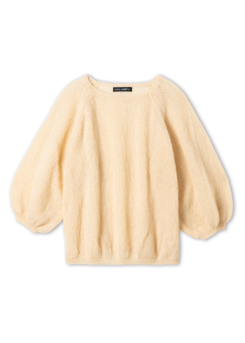 Lana Grossa-garen ‘Setasuri’ (69% alpaca (suri), 31% zijde, ca. 212 m/25 g): ca. 150 (150 - 175 - 175) g lichtbeige (kl 58); breinld 3,5 mm en 4; 1 korte rondbreinld 3,5 mm.