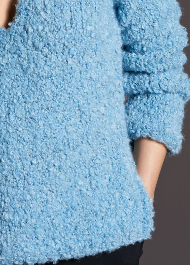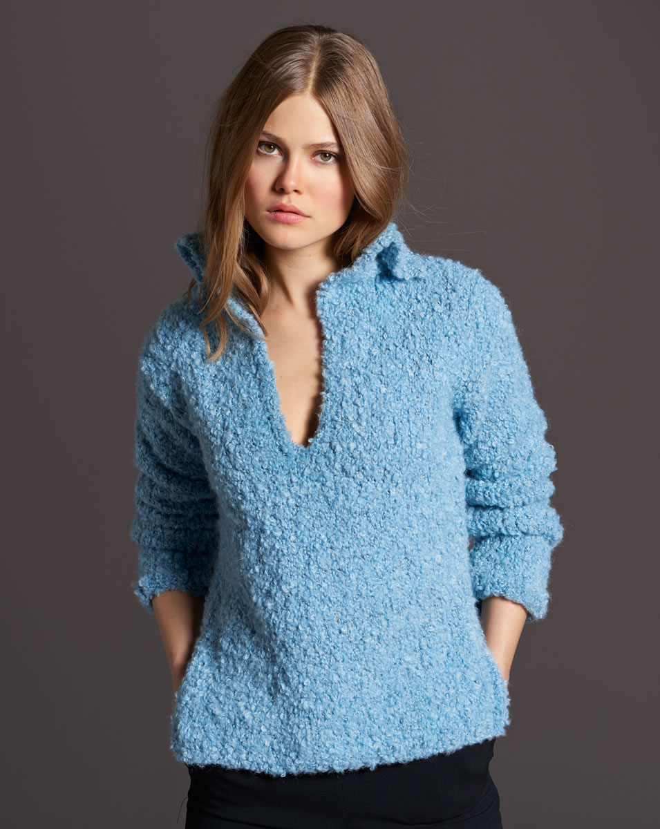 WINTER BLUES! Zeker niet! Want de lichtblauwe polotrui, gemaakt van een superzacht bouclégaren, zorgt met zijn frisse kleur en de heerlijk ongecompliceerde chic zelfs bij triest weer voor een goede stemming.