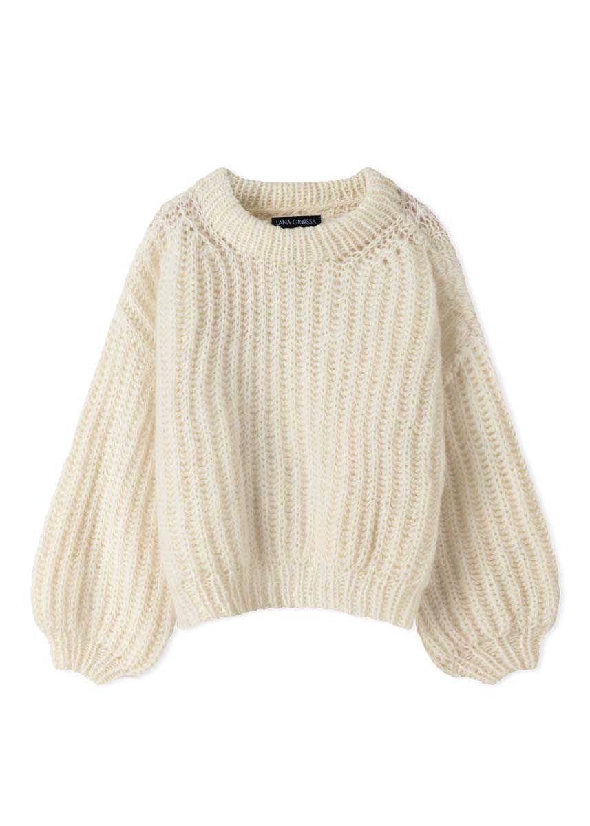 Lana Grossa Mohair di Gio (55% mohair (superkid), 45% scheerwol (merino superfijn), ca. 85 m/50 g), 450 (500 - 550 - 600) g gebroken wit (kl 9); breinld 6,5 mm en 7 mm; 1 rondbreinld 6,5 mm, 50 cm lang.