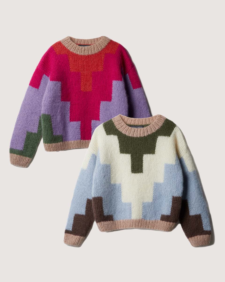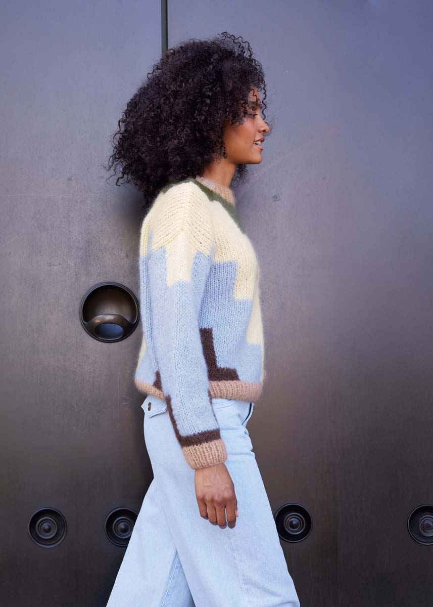 Lana Grossa Mohair di Gio (55% mohair (superkid), 45% scheerwol (merino superfijn), ca. 85 m/50 g), 200 (250 - 250) g seringpaars (kl 1), 100 (150 - 150) g felroze (kl 3), 100 (150 - 150) g resedagroen (kl 13), 50 (50 - 100) g oranjerood (kl 6) en 50 g beige (kl 8); breinld 6 mm en 7 mm; een 50 cm lange rondbreinld 6 mm.