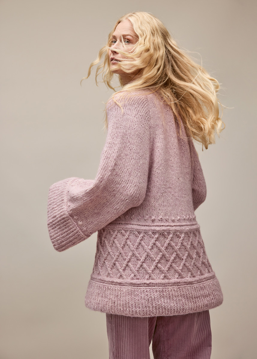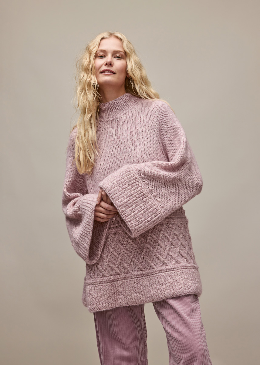 Lana Grossa Natural Alpaca Pelo (63% katoen, 31% alpaca (baby), 6% scheerwol (merino), ca. 125 m/50 g): 600 g roze gemêleerd (kl 15); 1 rondbreinld 4 mm en 5 mm, 80 – 100 cm lang (als de omvang vrij klein is volgens de magic-loop-methode br of met een heel korte rondbreinld 4 en 5 mm br); kabelnaald; 4 markeerring