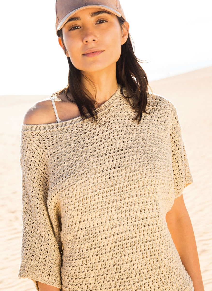 „Organico“ (100% bio katoen, looplengte = ca. 90 m/50 g) van Lana Grossa: ca. 450 (500 - 550) g beige (kl. 100); breinaalden nr. 5 en 5,5; 1 rondbreinaald nr. 5,5, 80 cm lang; 1 rondbreinaald nr. 4,5, 50 cm lang