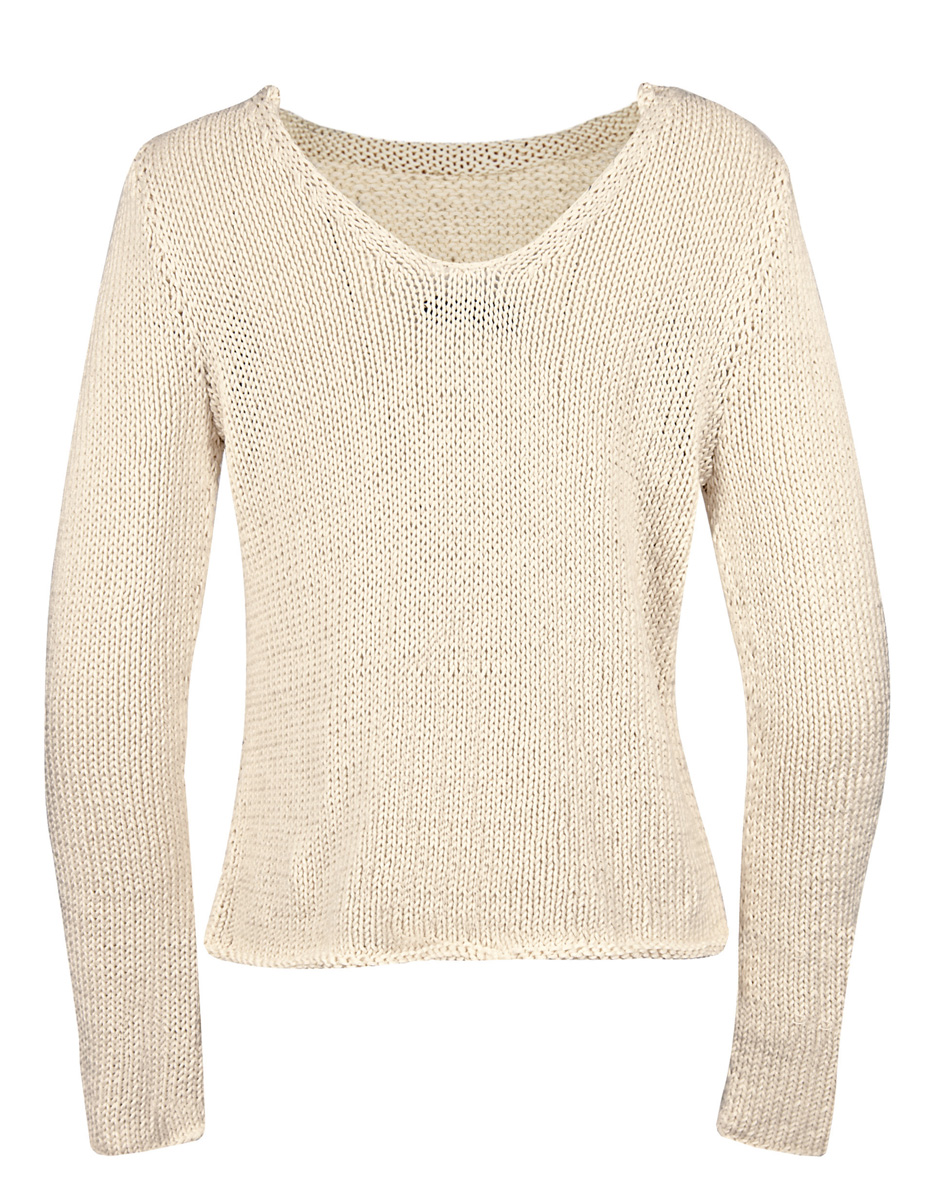 „Organico“ (100% (bio) katoen, ll. = ca. 90 m/50 g) van Lana Grossa: ca. 400 (450 – 500) g ecru (kl. 6); breinaalden nr. 5,5; 1 rondbreinaald nr. 6, 60 cm lang
