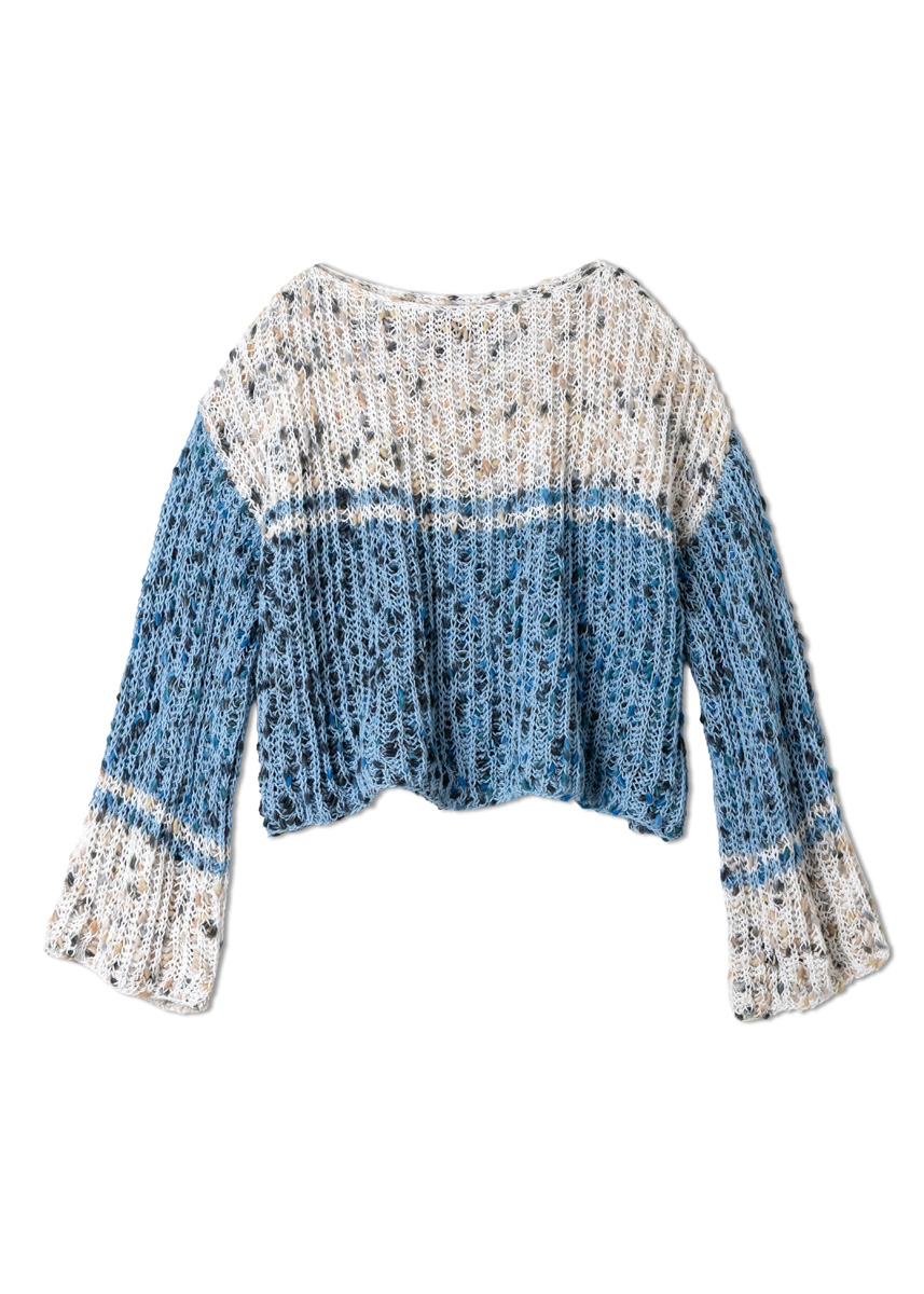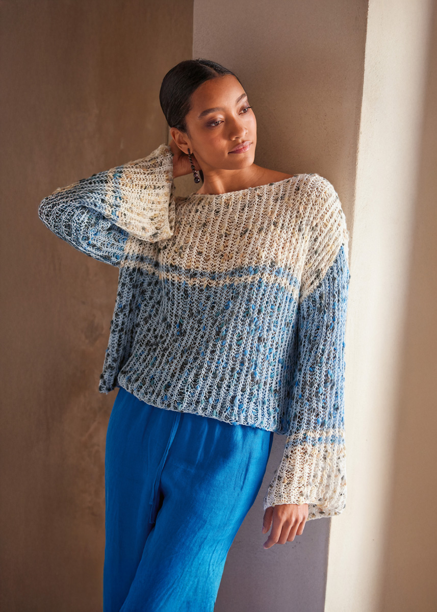 Lana Grossa Popcorn (100% katoen, ca. 125 m/50 g), 300 (300 - 350 - 350) g in lichtblauw/petrol/grafiet (kl 6) en 200 (250 - 300 - 300) g in wit/beige/camel/grijs/ antraciet (kl 9). Breinld 7 mm. 1 haaknld 6 mm