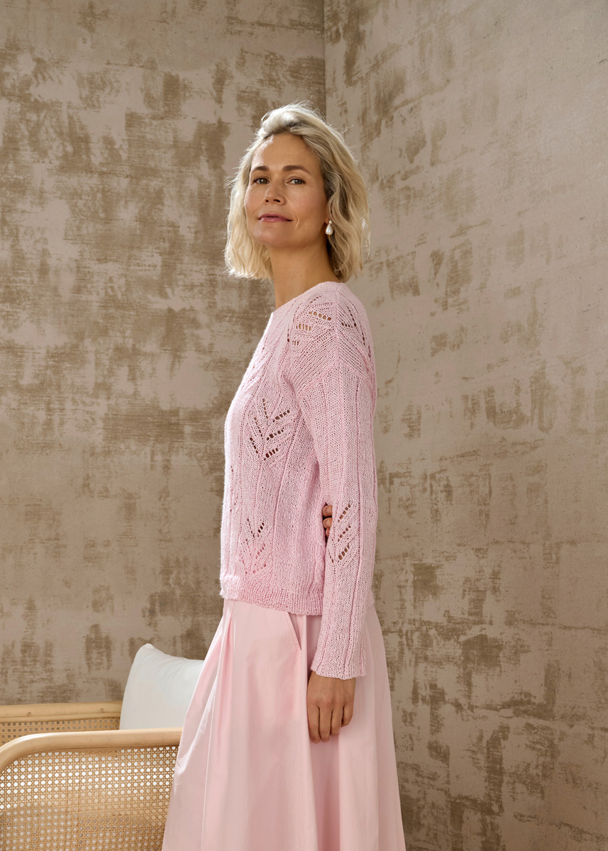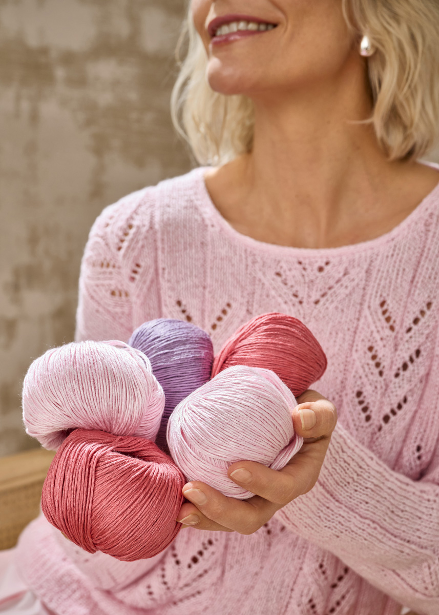 Lana Grossa Tencellino (51% linnen, 49% tencel, ca. 125 m/50 g), 500 (550 – 600) g roze (kl 13); breinld 3,5 mm en 4 mm, en 1 rondbreinld 4 mm, 40 cm lang.