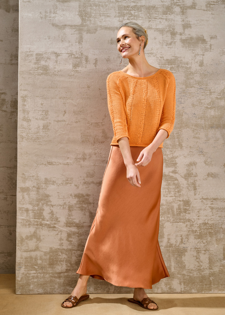 Lana Grossa Tessera (100% katoen, ca. 115 m/50 g), 400 (450 – 500) g mandarijn (kl 6); 1 rondbreinld 4,5 mm, 40 en 60 cm lang, 1 rondbreinld 5,5 mm, 40, 60 en 80 cm lang, 1 setje breinld zonder knop 4,5 mm en 5,5 mm, en 12 markeerringen (MR).