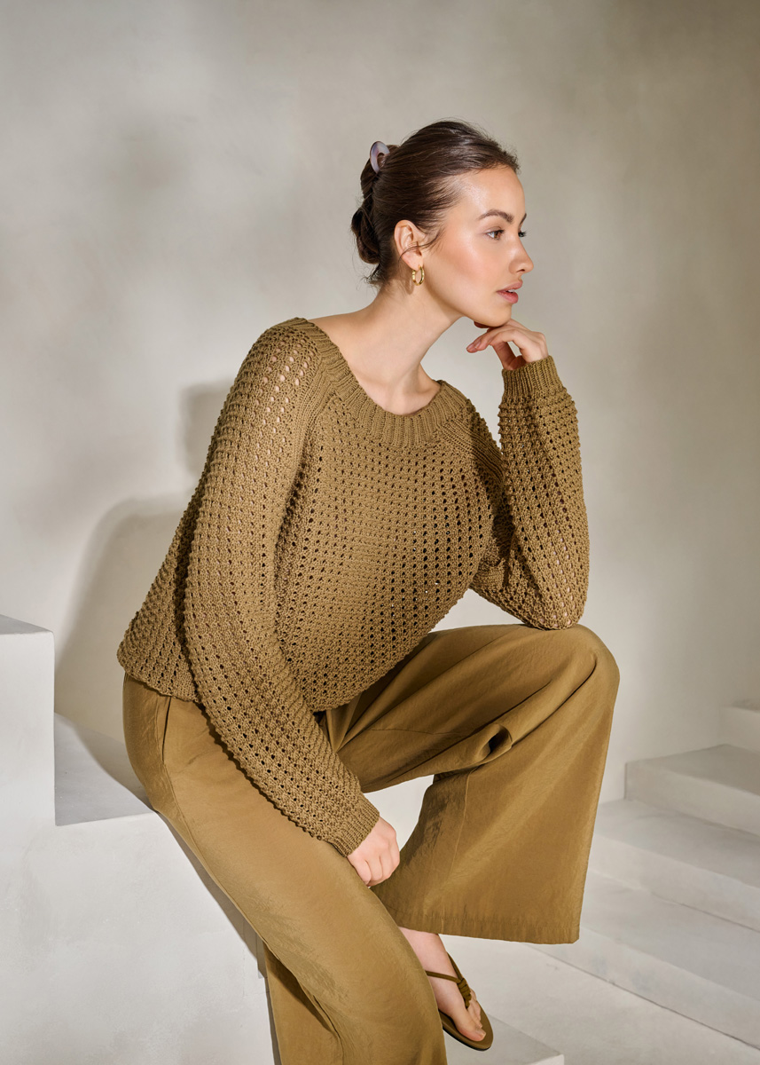 Lana Grossa Tessera (100% katoen, ca. 115 m/50 g), 550 (600 – 650) g groenbruin (kl 18); breinld 4,5 mm en 1 rondbreinld 4 mm, 40 cm lang