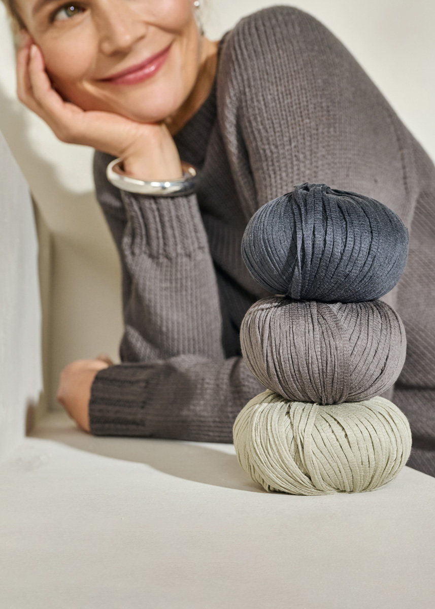 Lana Grossa Tessera (100% katoen, ca. 115 m/50 g), 500 (550 – 600) g donkergrijs (kl 15); 1 rondbreinld 4 mm (40 cm lang) 1 rondbreinld 5 mm, 40, 60 en 80 cm lang, 1 setje breinld zonder knop 4 mm, 8 markeerringen (MR).