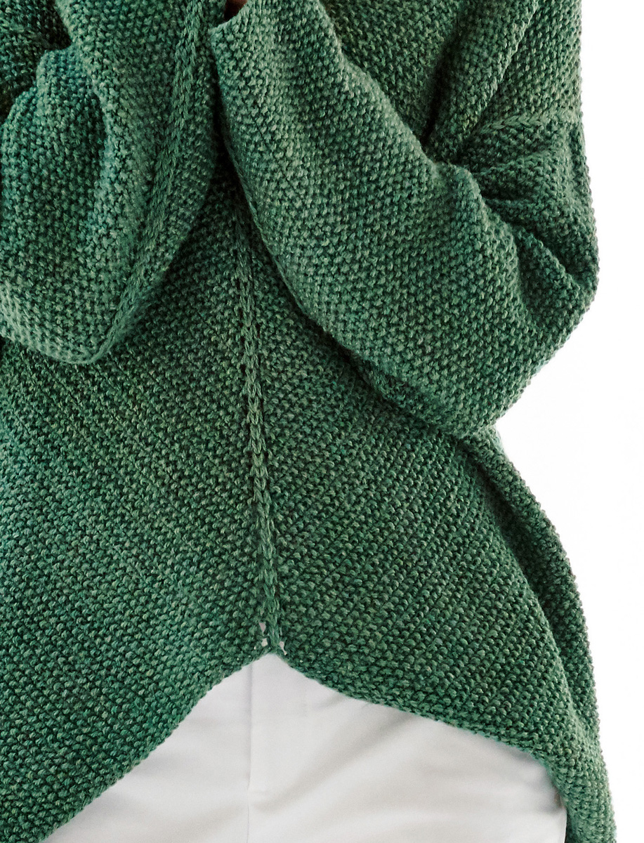 Lana Grossa Tre Seta (40% merinosscheerwol, 35% zijde, 20% baby alpaca, 5% viscose, looplengte 130 m/50 g), 550 (600 – 650 – 700) g groen (kl. 12); breinaalden nr. 5, 1 haaknaald nr. 4
