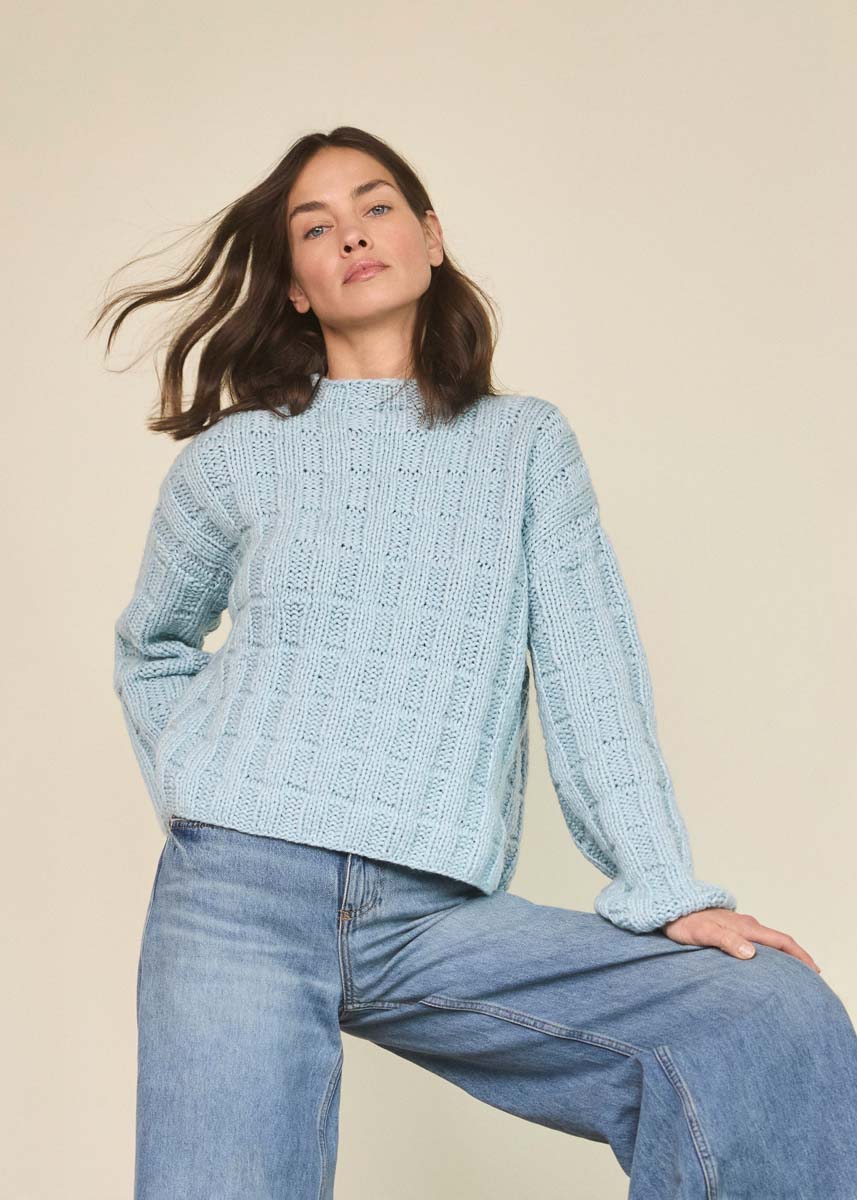 Lana Grossa-garen ‘Winter Softness’ (62% scheerwol (merino extrafijn), 38% katoen (bio), ca. 70 m/50 g): 550 (600 - 650 - 700) g mintblauw (kl 2); breinld 6 mm en 7 mm; korte rondbreinld 6 mm.