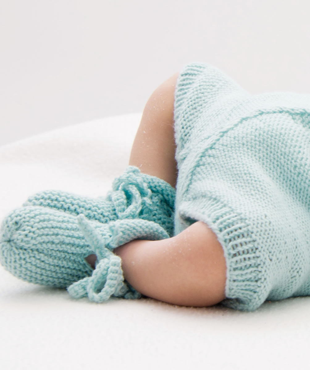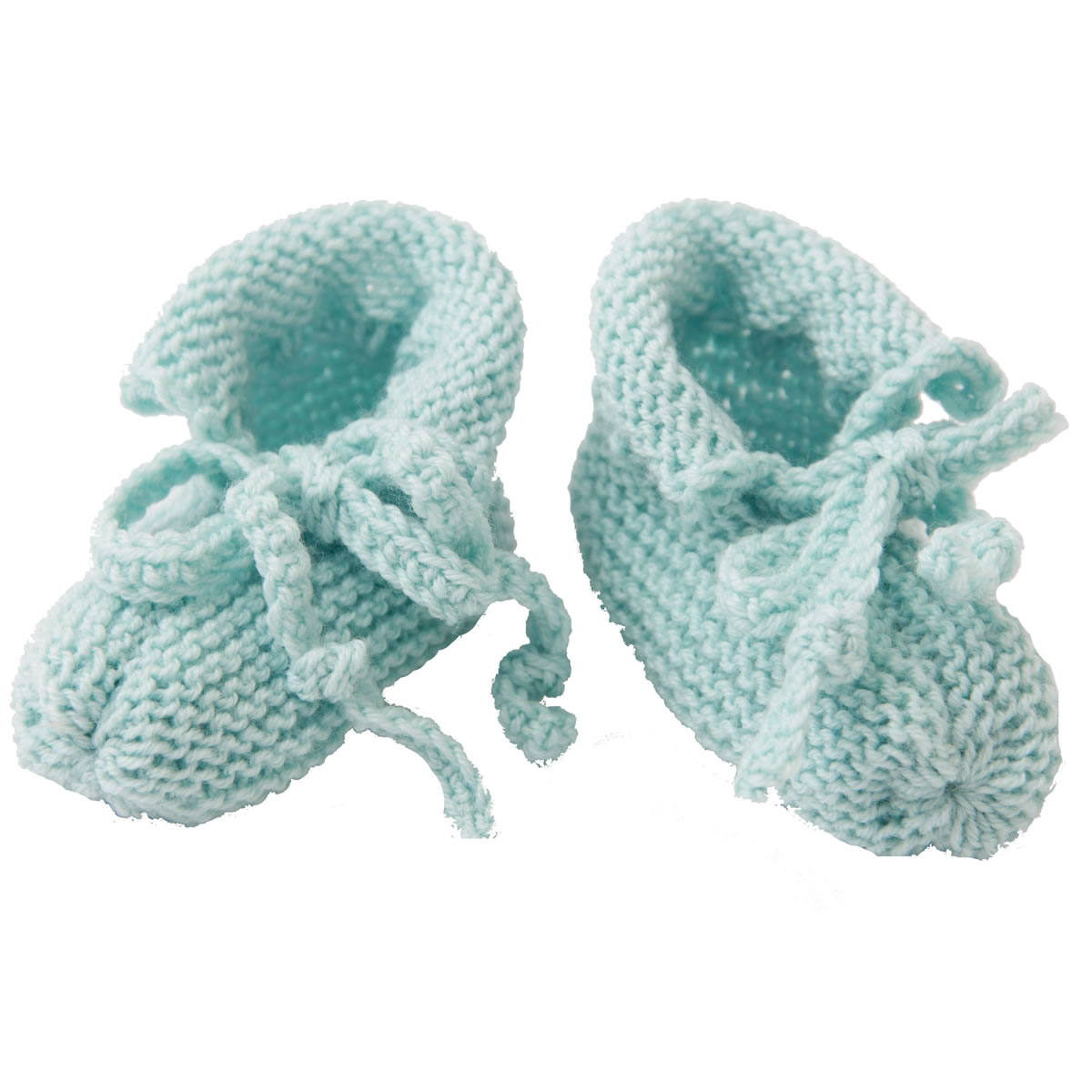 “Cool Wool Baby” (100% scheerwol, ll. = 220 m/50 g) van Lana Grossa: ca. 100 (150) g lichtturkoois (kl. 230); een 40 cm lange rondbreinld. nr. 3; een haaknld. nr. 2,5; 2 knopen en elastiek.