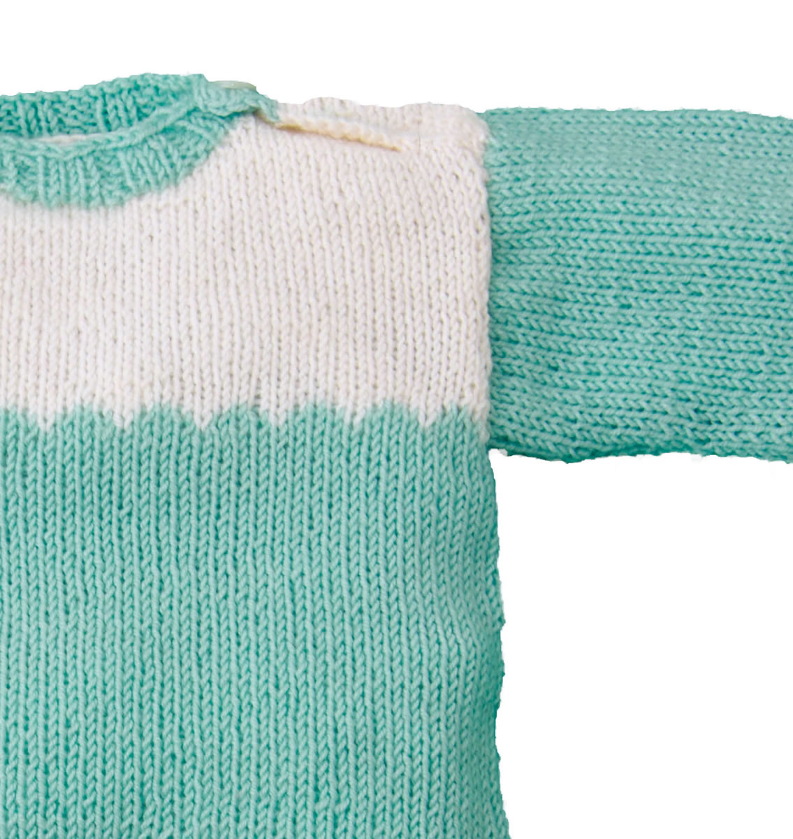 “Cool Wool Baby” (100% scheerwol, looplengte 220 m/50 g) van Lana Grossa: telk. ca. 50 g wit (kl. 207) en lichtturkoois (kl. 230); een 40 cm lange rondbreinld. nr. 3; een haaknld. nr. 2,5; 2 knopen en elastiek.