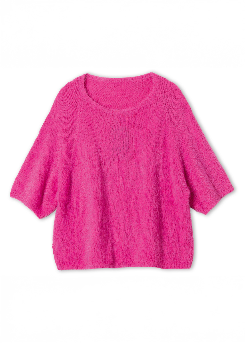 Lana Grossa-garen ‘Per Fortuna’ (74% katoen (bio), 26% polyamide, ca. 190 m/50 g): ca. 300 (300 - 350 - 350) g felroze (kl 3); breinld 3 mm en 3,5 mm; 1 korte rondbreinld 3 mm