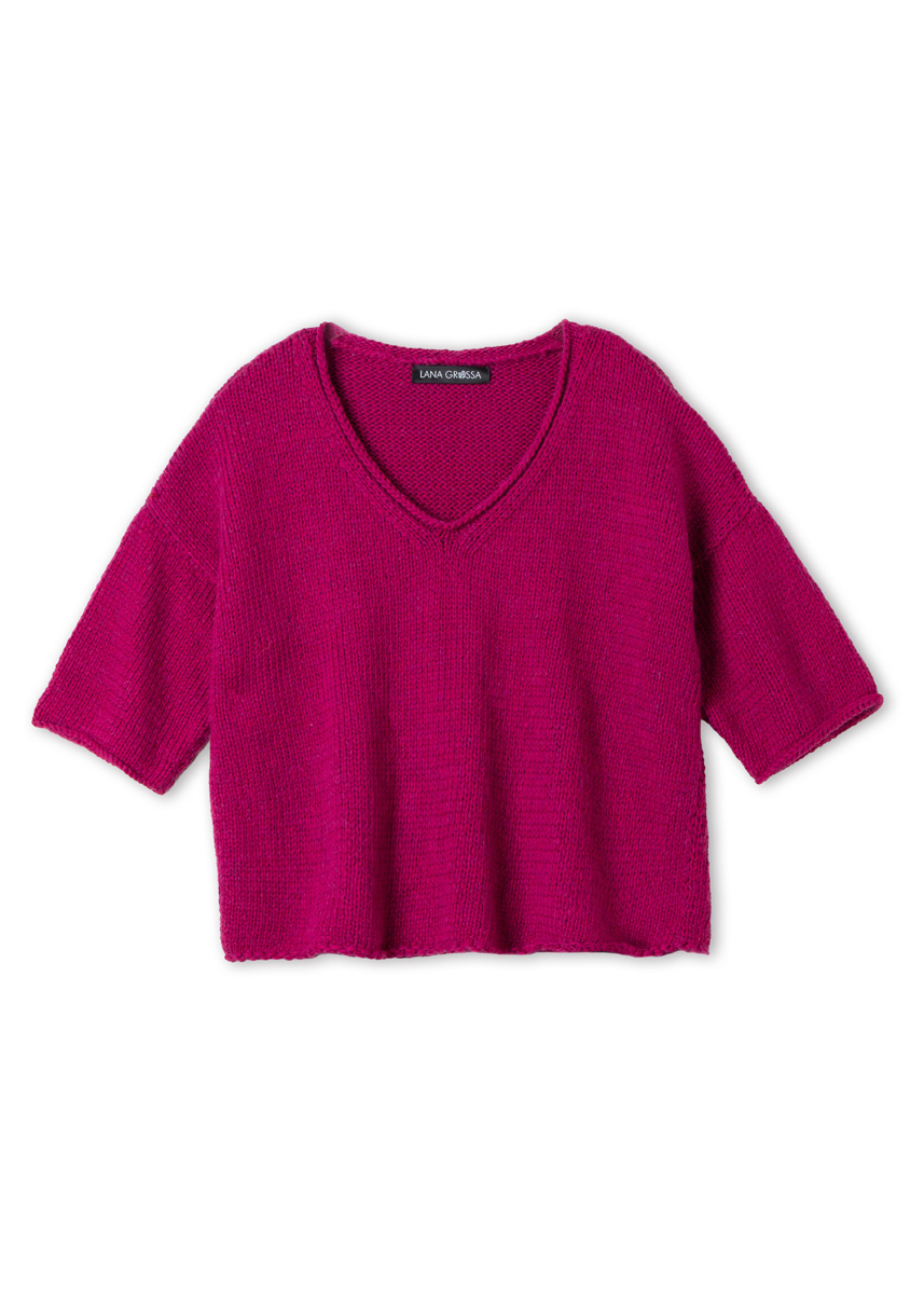 Lana Grossa-garen ‘Summer Softness’ (80% katoen (bio), 20% scheerwol (merino superfijn), ca. 130 m/50 g): ca. 300 (300 - 350 - 350) g fuchsia (kl 27); breinld 5 mm en 6 mm. 1 korte rondbreinld 5 mm.