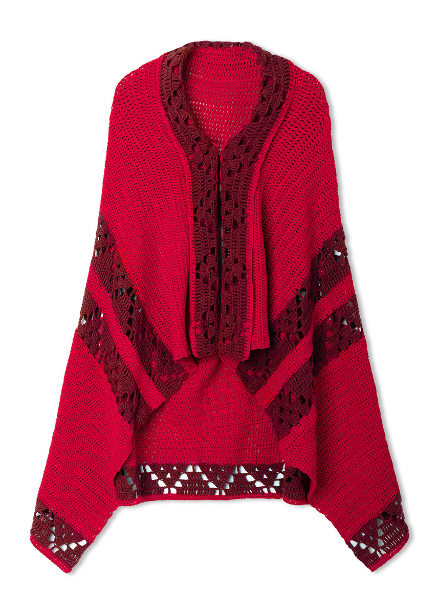 Lana Grossa-garen ‘Elastico’ (96% katoen, 4% polyester (elité), ca. 160 m/50 g): ca. 450 (500) g donkerrood (kl 23) en ca. 150 (200) g Oriëntaals rood (kl 168); 1 haaknld 4 mm en 4,5 mm; 2 drukkers (vastnaaien) van Prym, art. 19630, ø 20 mm, kl 10 transparant