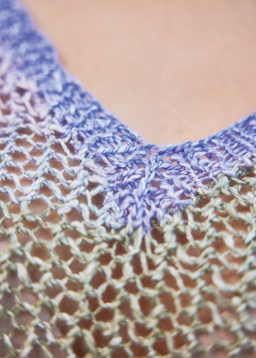 Lana Grossa qualité «Gomitolo Collina» (72 % coton, 28 % viscose, long. de fil = env. 260 m/100 g) : 4 (4 – 4 - 5) pelotes = env. 400 (400 - 400 - 500) g en vanille/rose/violet antique/gris vert/gris brun/terre cuite (col. 1014) ; aig. à tric. n° 3 et 3,5 ; aig. circ. courte n° 3.
