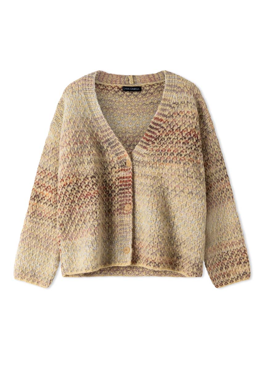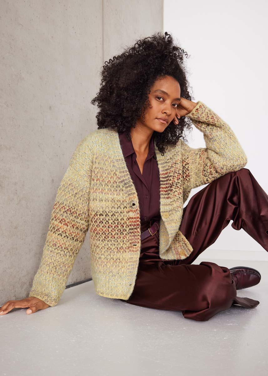 Lana Grossa Airy (42% (baby) alpaca, 40% katoen, 18% scheerwol (merino extrafijn), ca. 170 m/50 g), 200 (250 - 300) g vanille (kl 18) en Lana Grossa Picasso (36% scheerwol (merino extrafijn), 36% (baby) alpaca 28% polyamide, ca. 210 m/50 g), 150 (150 - 200) g beige/roze/ lichtgrijs/wit/noga/zandbeige/camel (kl 17); breinld 6 mm; 3 knopen, maat ca. 22 mm Ø; 2 hulpnld