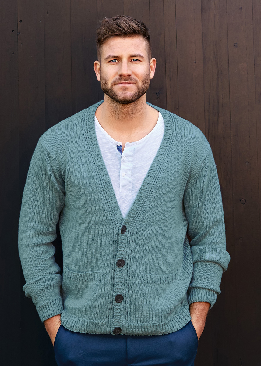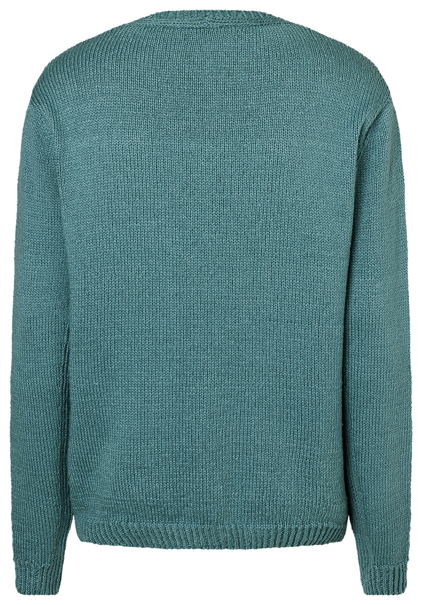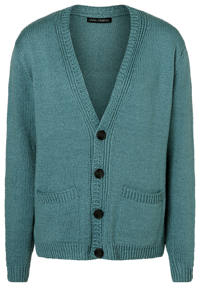 Lana Grossa Alta Moda Cotolana (45% scheerwol (merinos), 45% pima katoen, 10% polyamide, looplengte 150 m/50 g), 650 (700 – 750) g pastelturkoois (kl. 12); breinaalden nr. 3,5 en 4, 1 rondbreinaald nr. 3,5, 100 cm lang, 4 knopen van UNION KNOPF, art. 39145, kl. 78, afmeting 25 mm