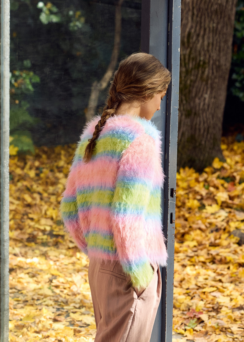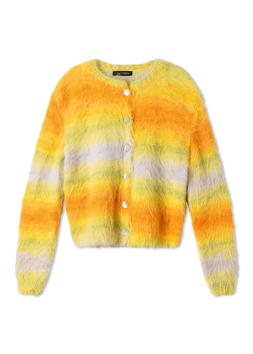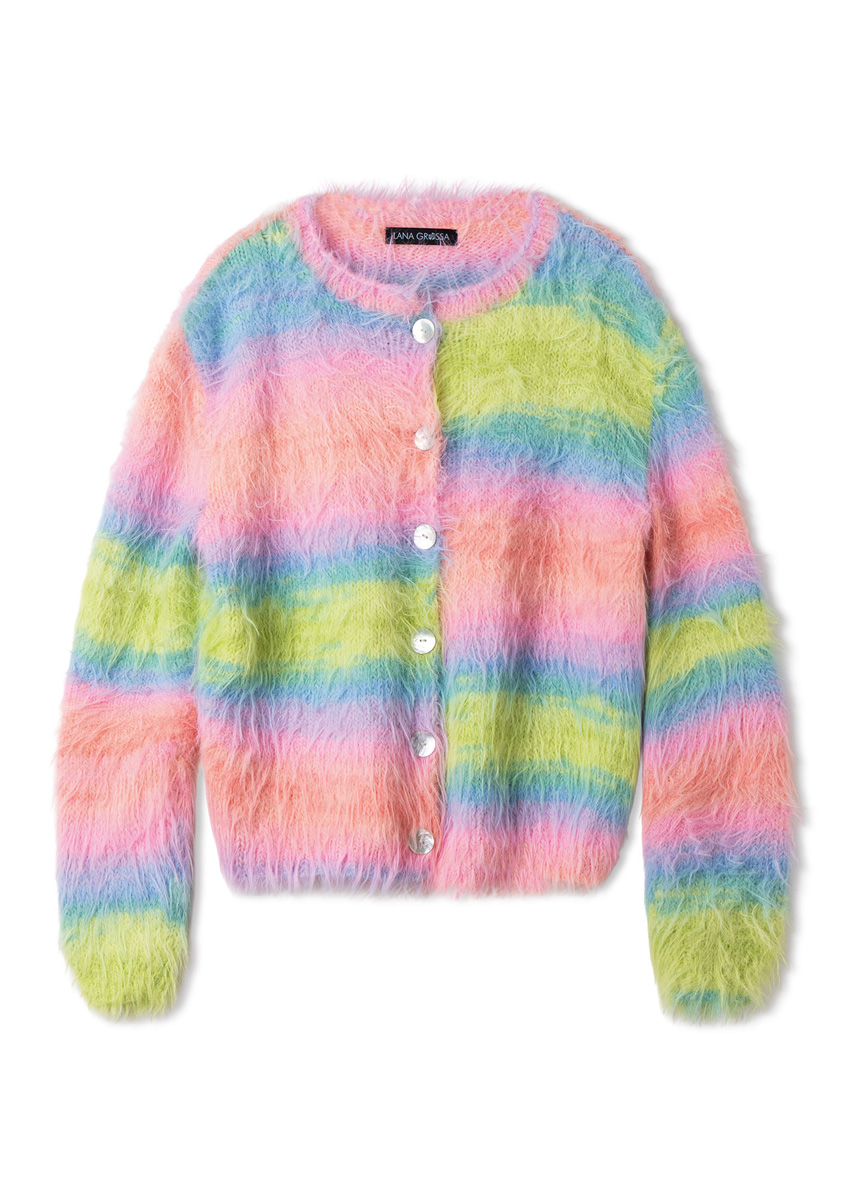 Lana Grossa-garen ‘Basta Mista’ (50% scheerwol (merino), 50% polyamide, ca. 100 m/50 g): 450 (500 - 550 - 600) g limoen/turkoois/aqua/zalm/roze/sering (kl 113) of 450 (500 - 550 - 600) g gebroken wit/lichtgrijs/grijsblauw/ witgroen/turkoois/mintturkoois (kl 116) of 450 (500 - 550 - 600) g greige/vanille/geel/groengeel/zonnebloemgeel/oranje (kl 114); breinld 4 mm en 4,5 mm; 1 korte rondbreinld 4 mm; 6 parelmoeren knopen, doorsnee 20 mm.