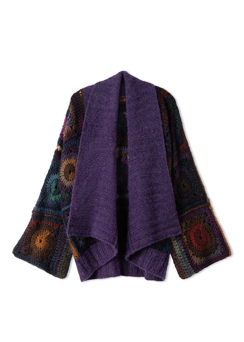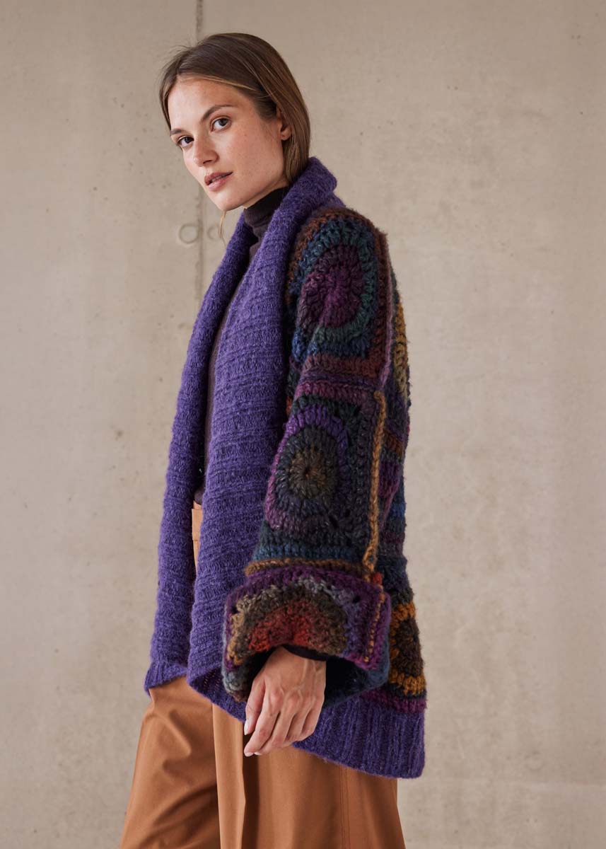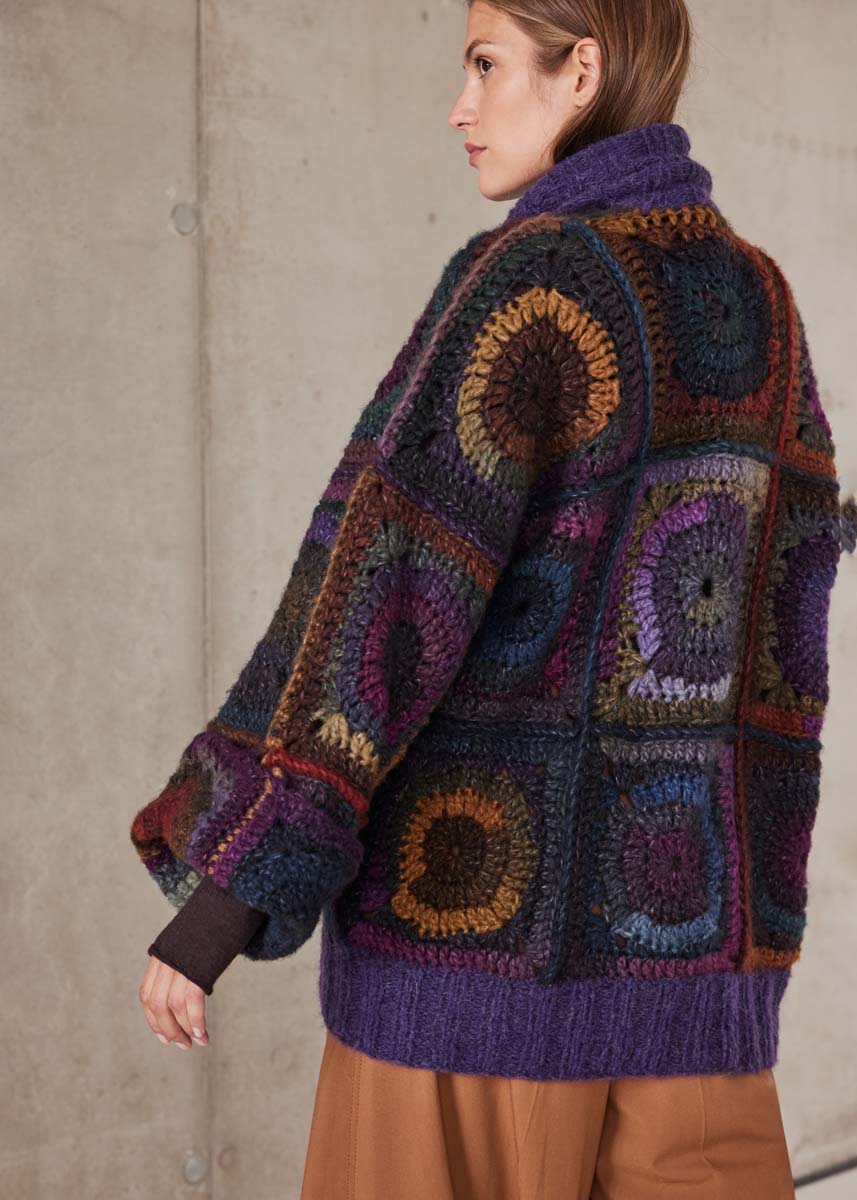 Lana Grossa Bomba (85% scheerwol (merino extrafijn), 15% polyamide, donker groen/donker petrol/witgroen/grijs groen/citroengeel/ geel/donker grijs/maïsgeel/zalm/koraal/braam/donker violet/ oranje (kl 4) en Lana Grossa Alpaca Air II (50% alpaca (baby), 27% polyamide, 14% katoen, 9% scheerwol (merino), ca. 140 m/50 g), 150 g donkerviolet (kl 21); 1 haaknld 8 mm; 1 rondbreinld 6 mm, 100 cm lang.