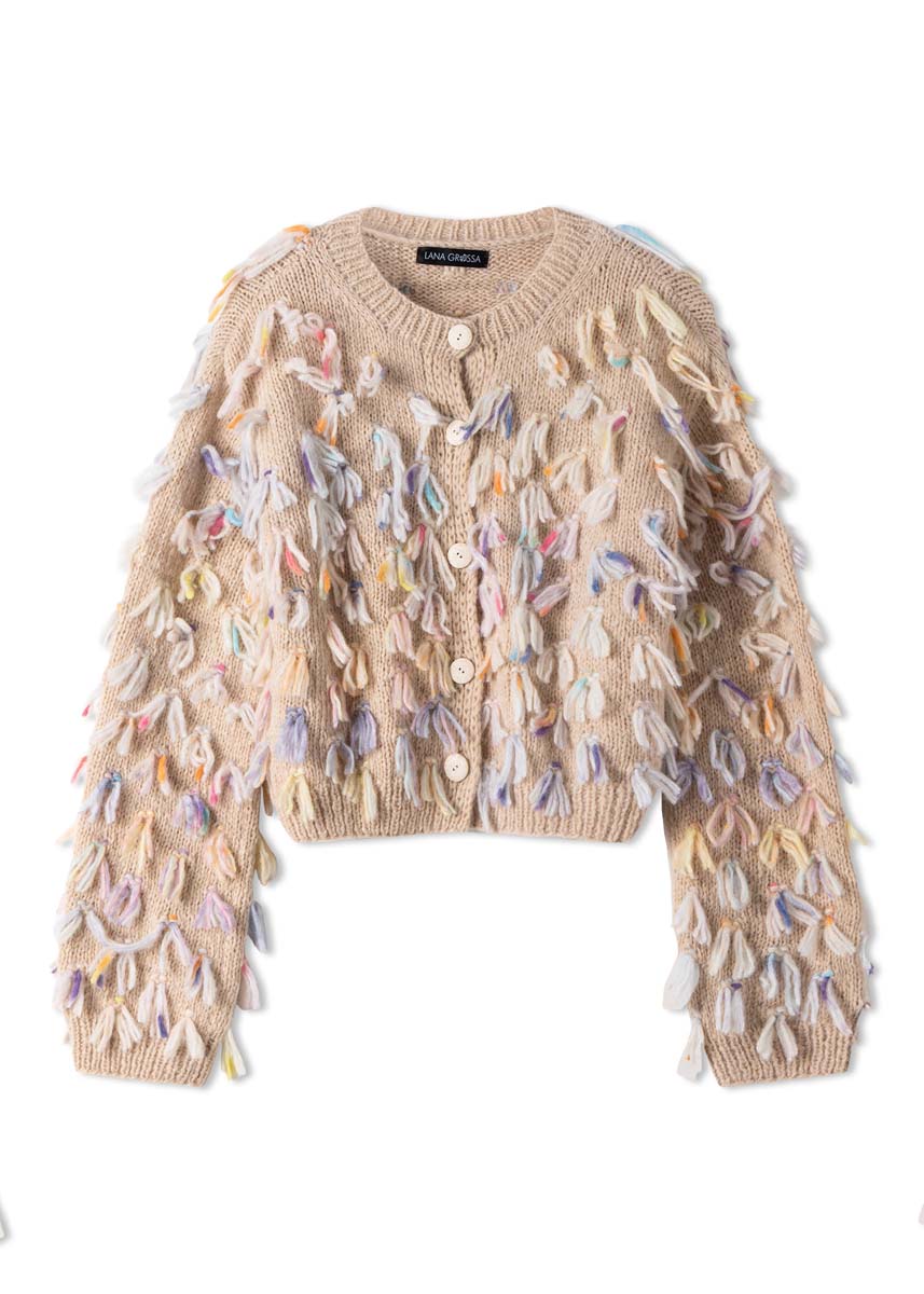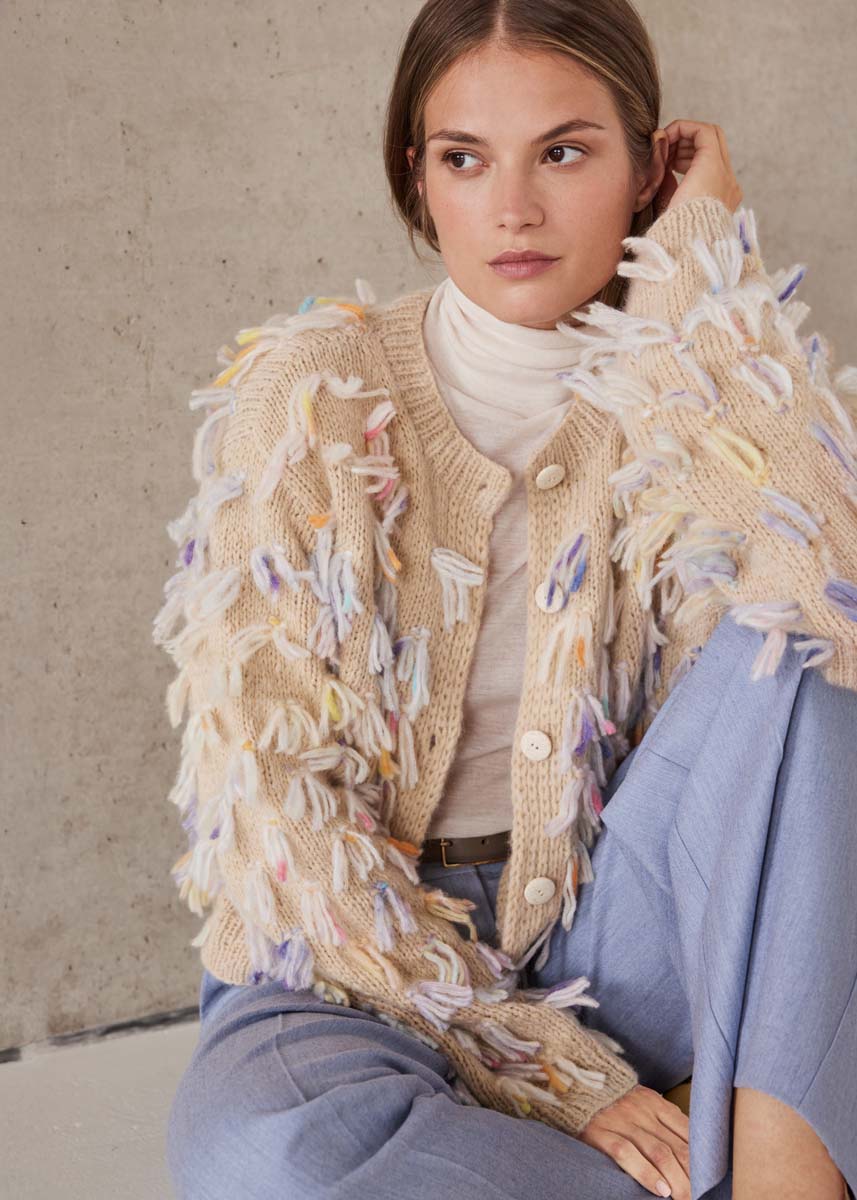 Lana Grossa Brigitte No. 2 (47% alpaca (baby), 45% katoen, 8% scheerwol (merino), ca. 140 m/50 g), 350 (400 - 450) g lichtbeige (kl 47) en Lana Grossa Cassata (54% scheerwol (merino extrafijn), 30% polyamide, 16% katoen, ca. 175 m/50 g), 100 g gebroken wit/oranje/violet/ lichtblauw/geel (kl 8); breinld 5 mm en 6 mm; 1 rondbreinld 5 mm, 60 cm lang; 5 beige knopen, 25 mm Ø.