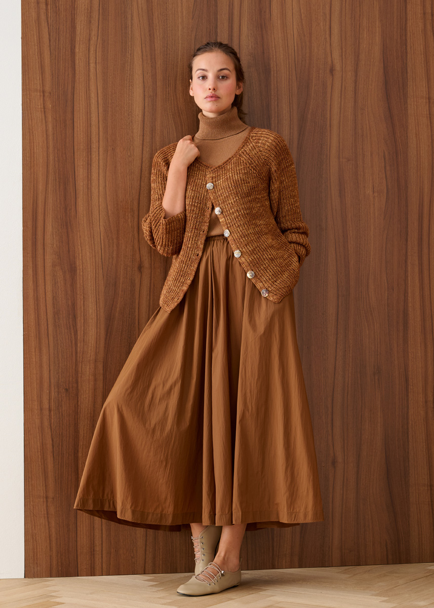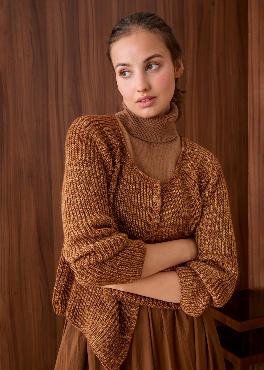 Lana Grossa Brigitte Silkdream (60% scheerwol (merino fijn), 30% zijde, 10% mohair superkid, ca. 270 m/50 g), 350 (400 – 450) g camel (kl 1); breinld 3,5 mm en 1 rondbreinld 3 mm (40 cm lang) en 6 knopen van UNION KNOPF, art. 37604, kl 12, Ø 22 mm